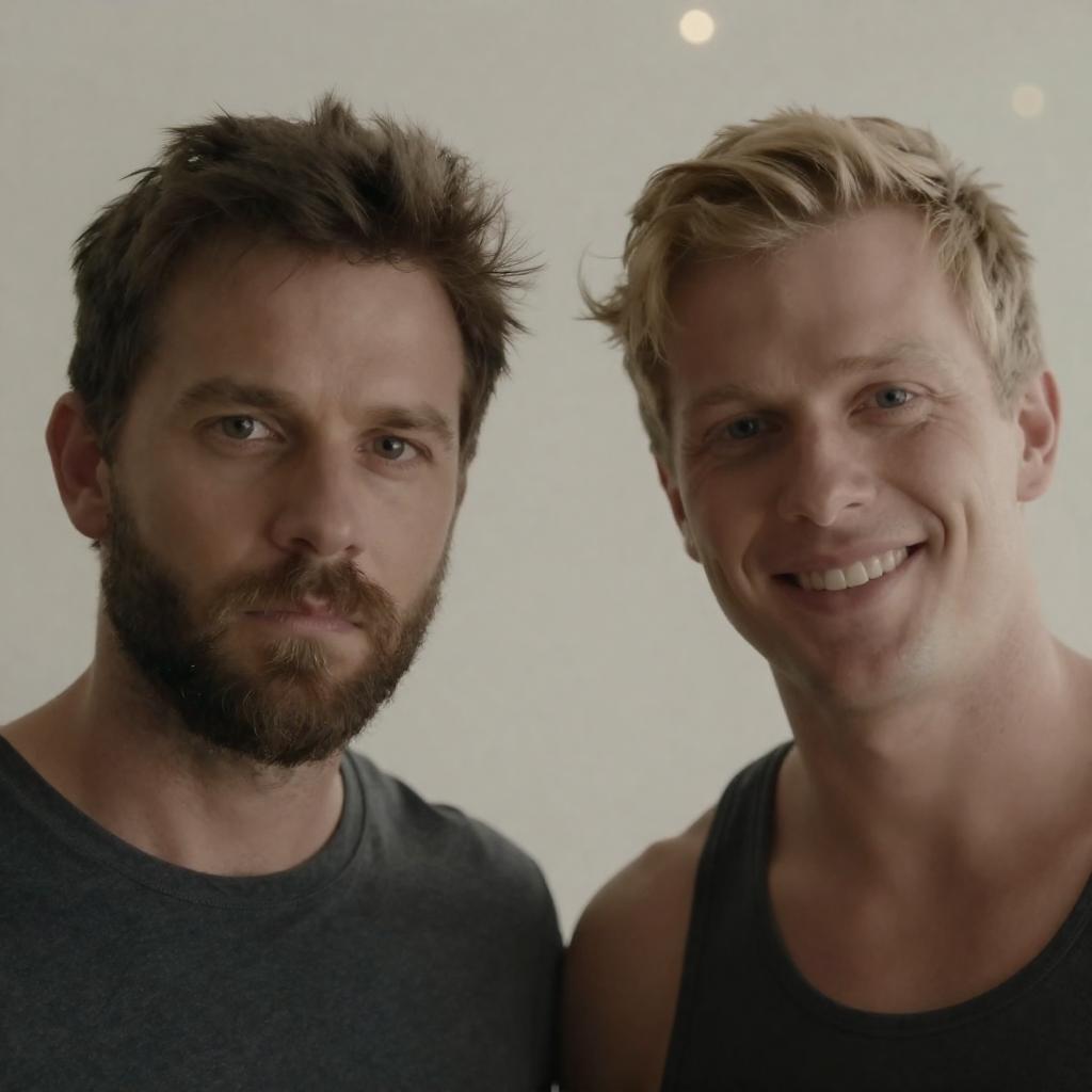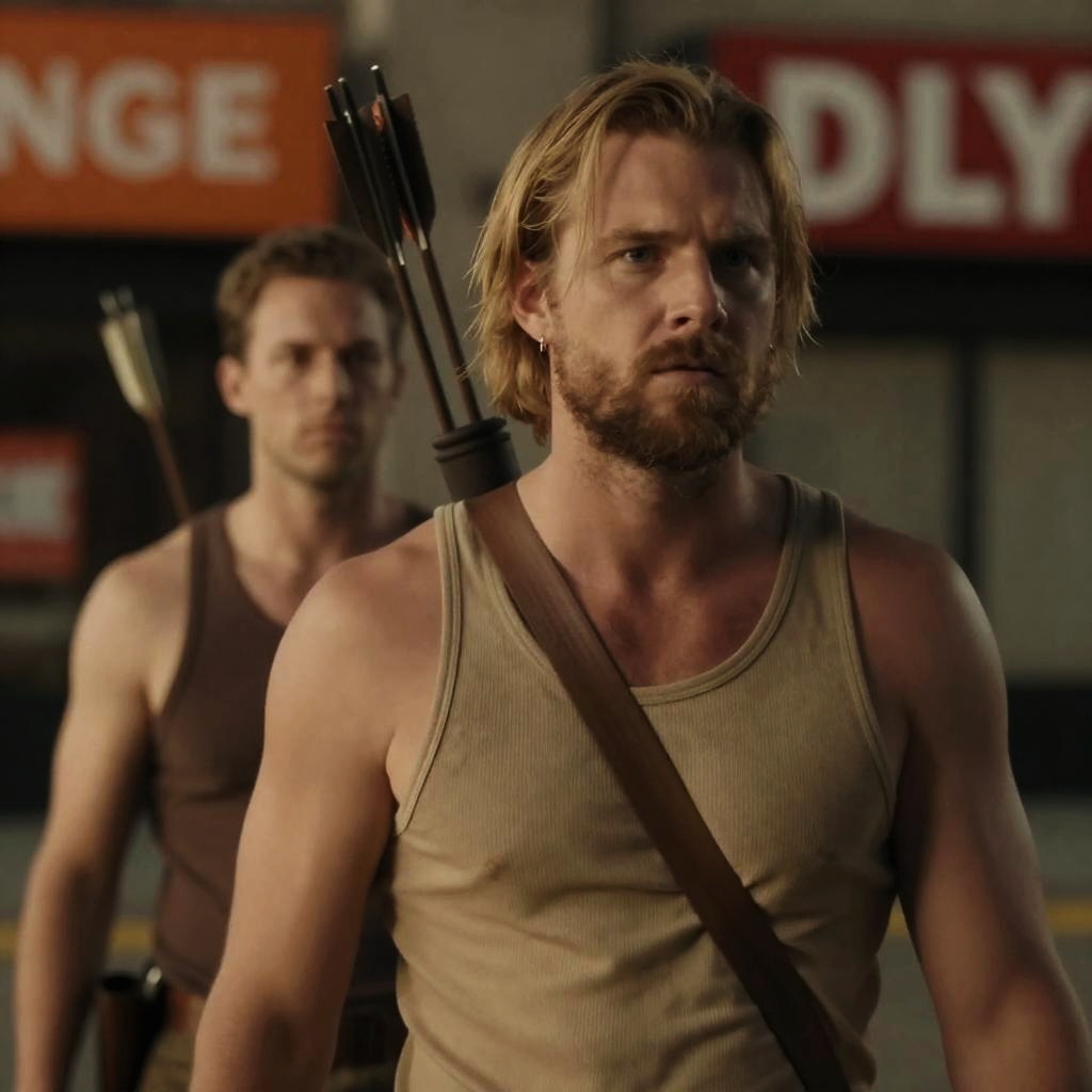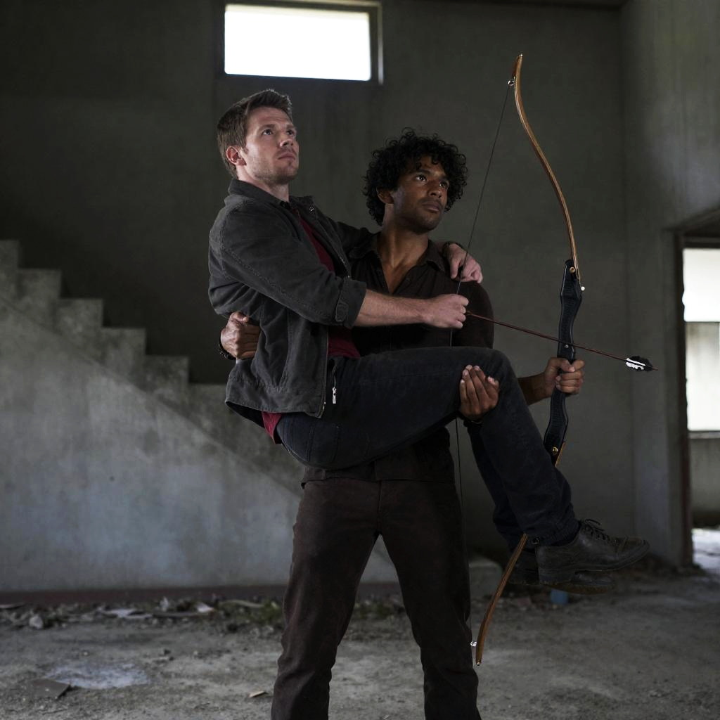 Two men in a dimly lit, abandoned, and dilapidated concrete building. One man with short brown hair, wearing a gray jacket, red shirt, and dark pants is being carried by another man with curly black hair, dressed in a dark brown shirt and pants. The carrying man holds a traditional wooden recurve bow with a nocked arrow. A small window near the ceiling lets in faint light, illuminating the rough concrete walls and a concrete staircase in the background.