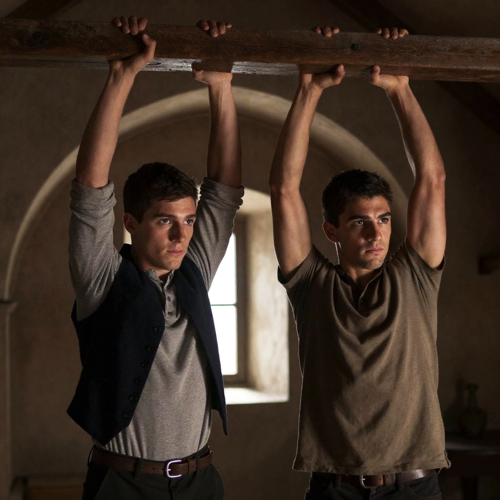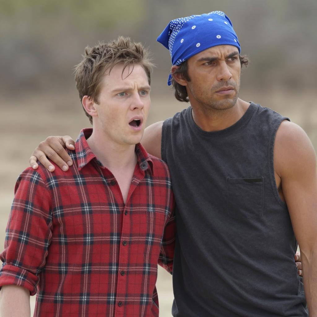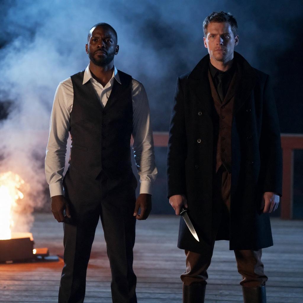 Two men in a dimly lit, abandoned, and dilapidated concrete building. One man with short brown hair, wearing a gray jacket, red shirt, and dark pants is being carried by another man with curly black hair, dressed in a dark brown shirt and pants. The carrying man holds a traditional wooden recurve bow with a nocked arrow. A small window near the ceiling lets in faint light, illuminating the rough concrete walls and a concrete staircase in the background.