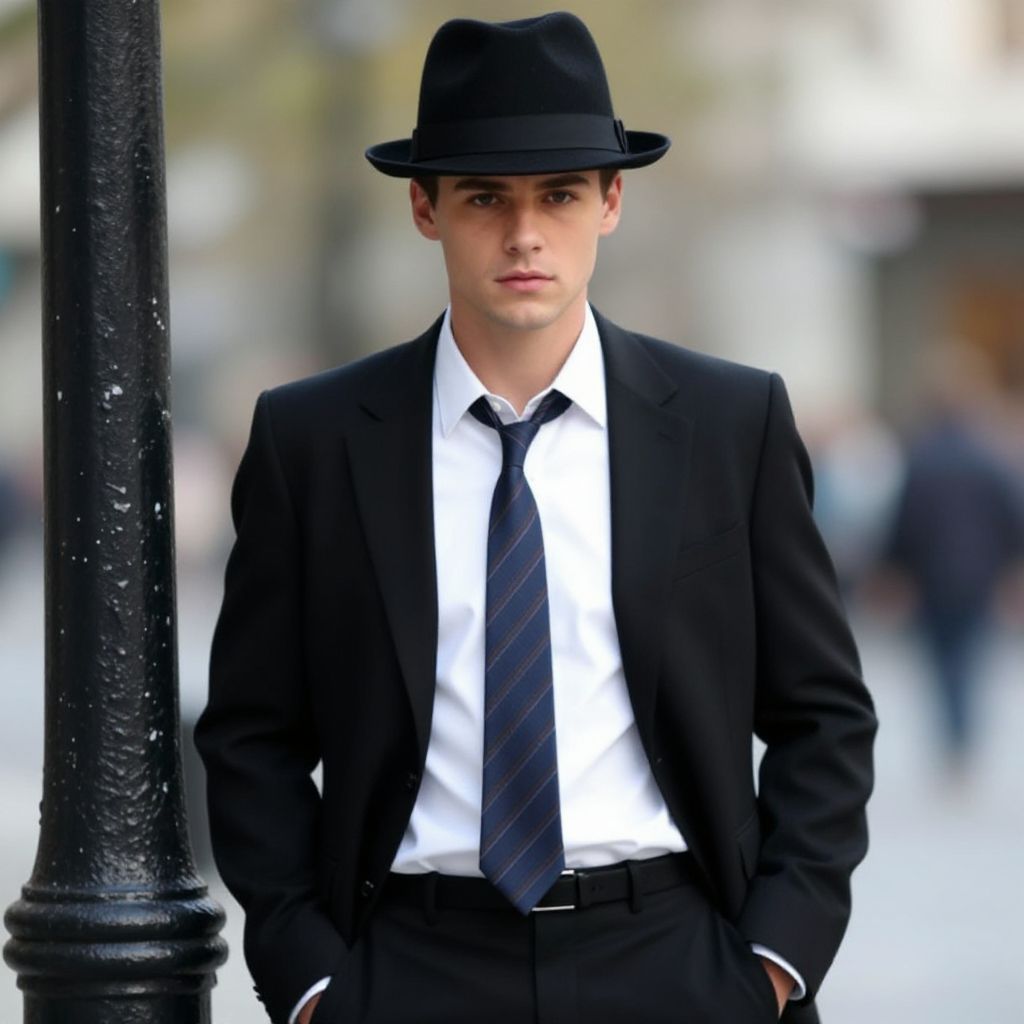 Photograph of a young Caucasian man with fair skin and short brown hair, wearing a black fedora, black suit, white dress shirt, and blue striped tie. He stands with his hands in his pockets, facing the camera with a neutral expression. The background is blurred, featuring a black lamppost and indistinct urban scenery with people and buildings. The overall style is sharp and modern, with a focus on the man's formal, stylish attire. The lighting is natural, highlighting his clean, polished appearance.