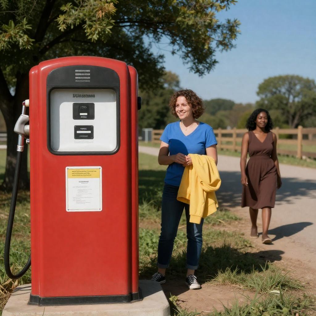 Photograph of a rural scene. Red gas pump in foreground, two people in background. Woman with short curly hair, blue shirt, holding yellow jacket, smiling. Black woman with long hair, brown dress, walking. Wooden fence, trees, blue sky, sunlight. Grass and dirt ground.