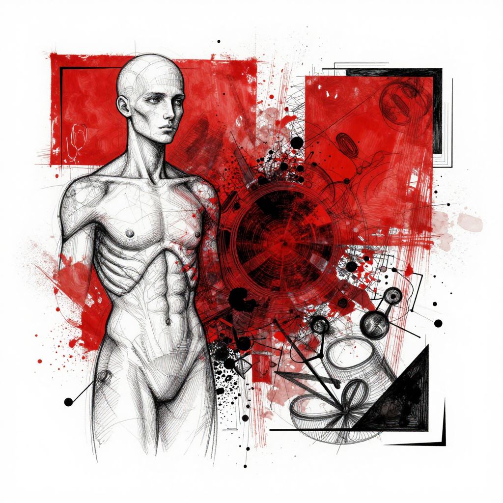 Trashpolka style art piece featuring a combination of fragmented human anatomy sketches, textured red brush marks, black fine line details, chaotic ink drops, and geometric accents, producing a powerful contrast-rich composition full of energy and abstract storytelling.