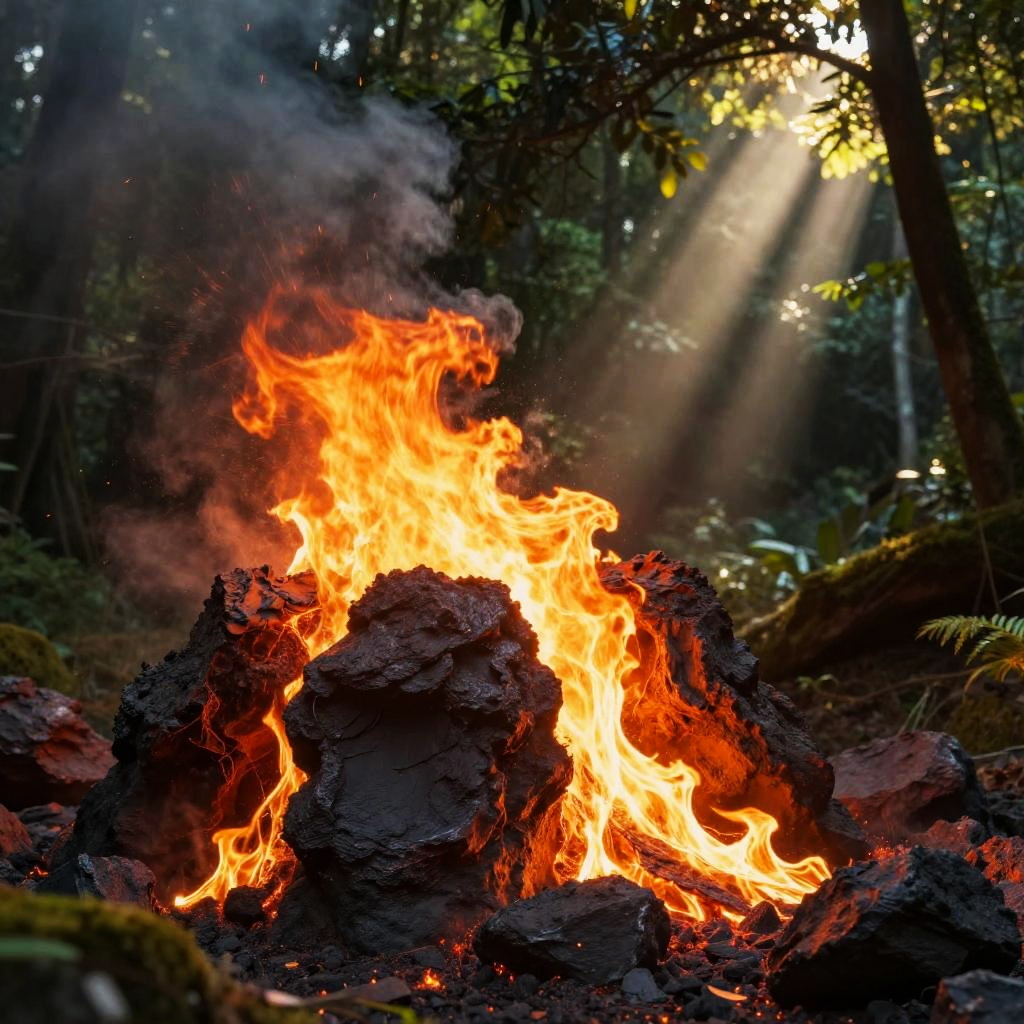 Sunfire erupting from ancient volcanic rocks in a mystical forest, vibrant flames intertwined with sunlight beams piercing through dense foliage, glowing embers floating in the air, cinematic atmosphere with a fantasy art style and rich warm tones.