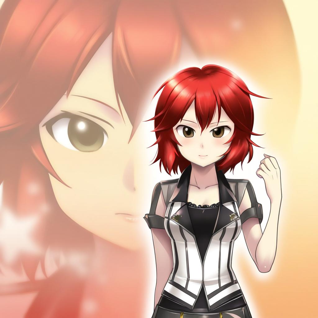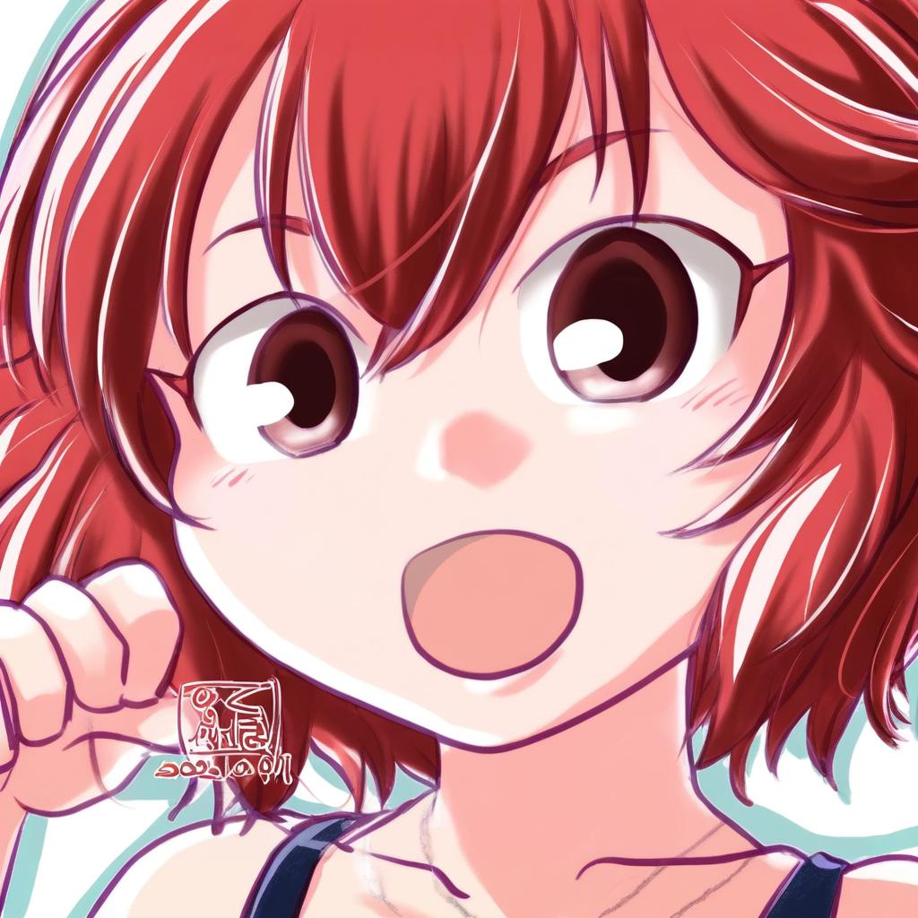 Digital anime-style illustration of a girl with short red hair and large brown eyes. The character has a surprised or excited expression with an open mouth. She wears a black tank top and the image prominently features detailed hair strands and soft shading.