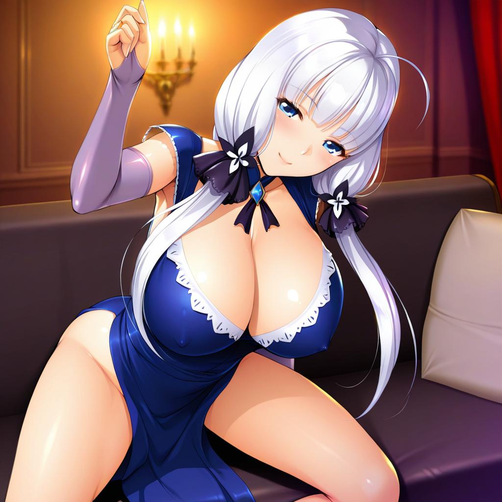 Digital anime-style artwork of a female character with long white hair tied with black bows featuring white flowers. She has striking blue eyes and is dressed in a tight, dark blue dress with white frills, sitting on a couch in an indoor setting with warm lighting. The character's pose is dynamic and expressive.