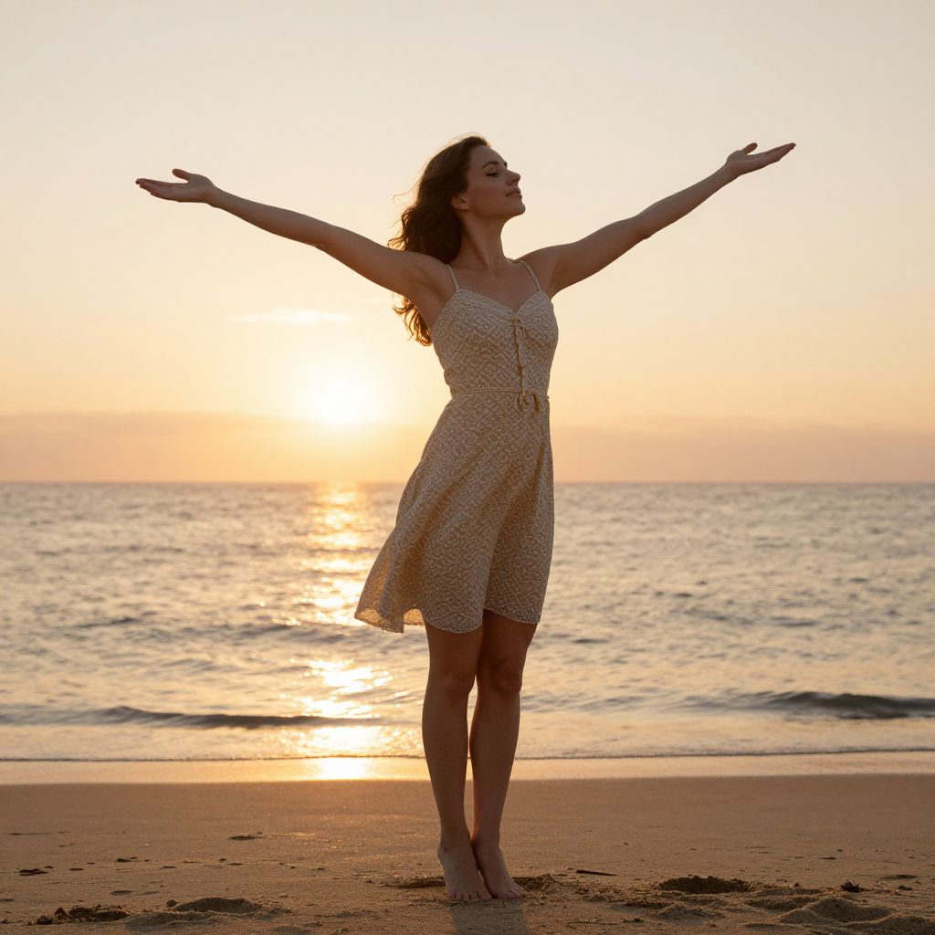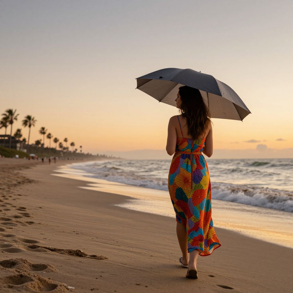 A woman in a light blue dress stands by the seashore, holding an umbrella, with the sun setting behind her, casting golden hues over the water and sand.