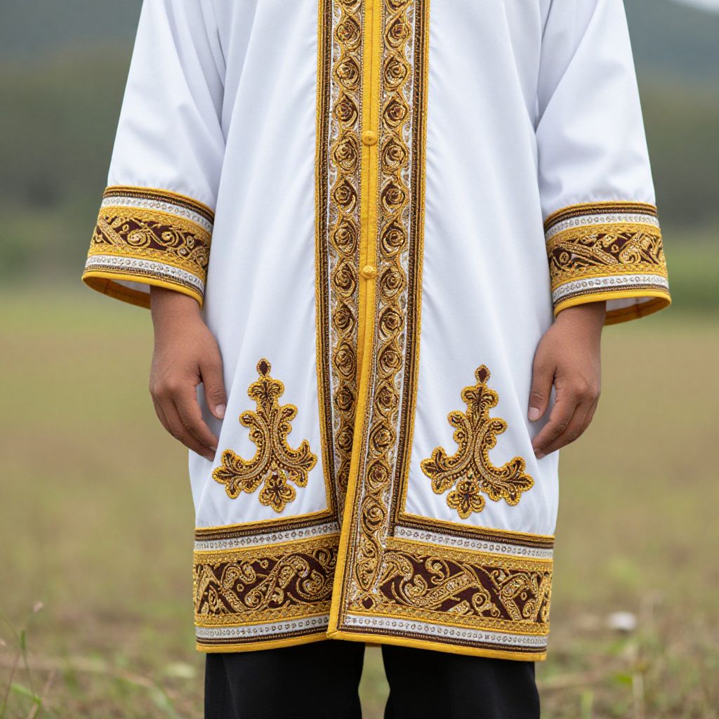 Photograph of a person standing outdoors in a grassy field with a mountainous background. The person is wearing a white, long-sleeved, religious robe adorned with intricate gold embroidery, featuring ornate cross patterns on the front and sides. The robe has black and gold trim along the edges and sleeves. The person's hands are relaxed by their sides, and only the torso and lower part of the face are visible. The robe's texture appears smooth and slightly reflective due to the embroidery. The background is slightly blurred, emphasizing the robe's detailed embroidery.