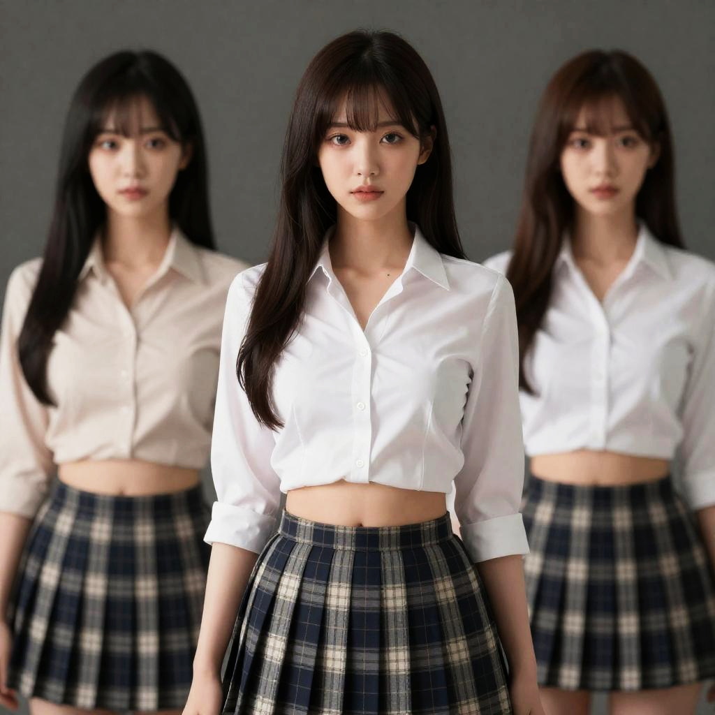 Photo-realistic image of three young East Asian women standing in a row, wearing pleated plaid skirts and collared shirts. The woman in the center wears a white shirt with sleeves rolled up and a midriff exposed. The two women behind her wear similar outfits with one in a beige shirt and the other in a white shirt. All have long dark hair with bangs and neutral facial expressions. The background is plain and gray.