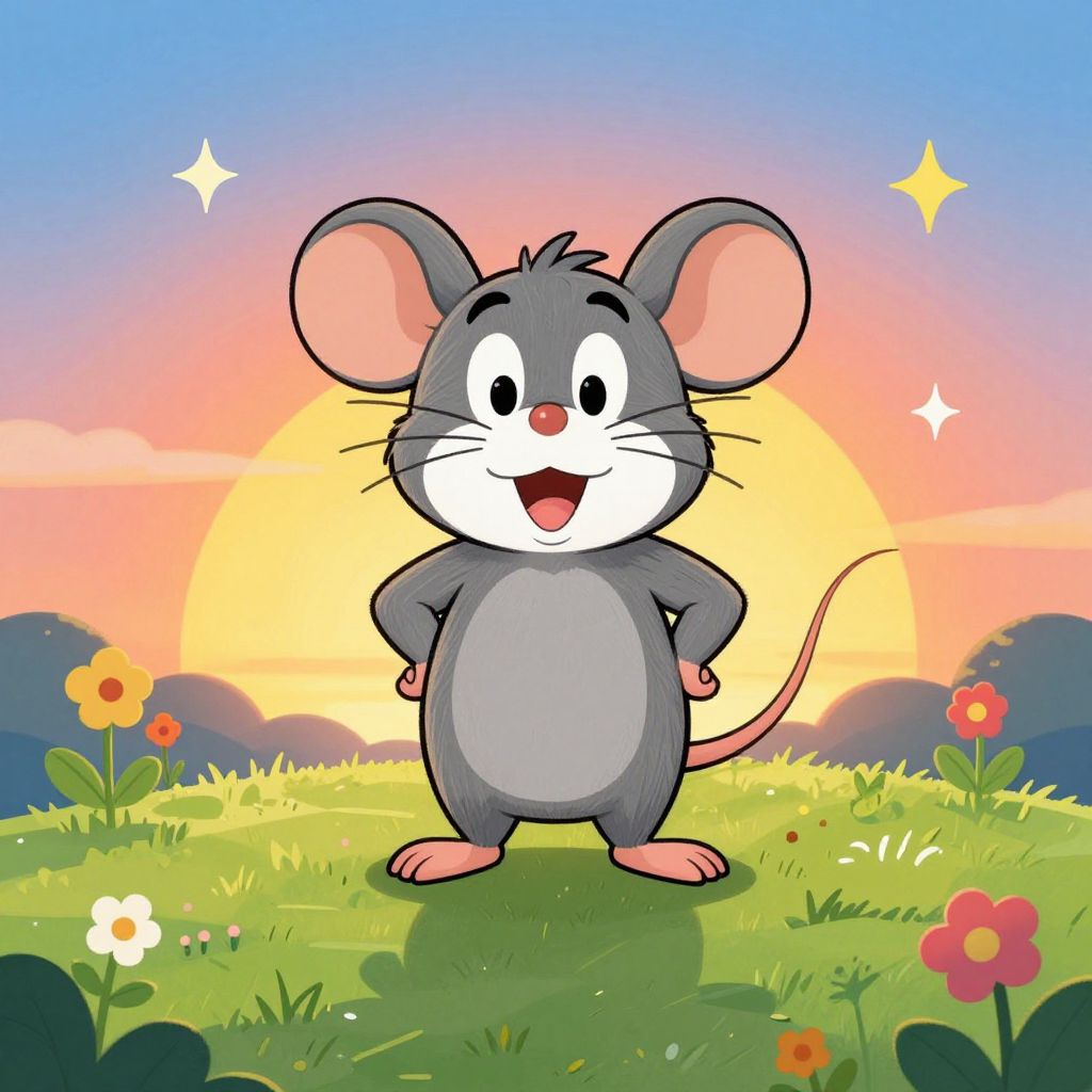 Cartoon gray mouse with large ears and white chest stands on grassy hill, smiling at sunset with colorful flowers and stars.