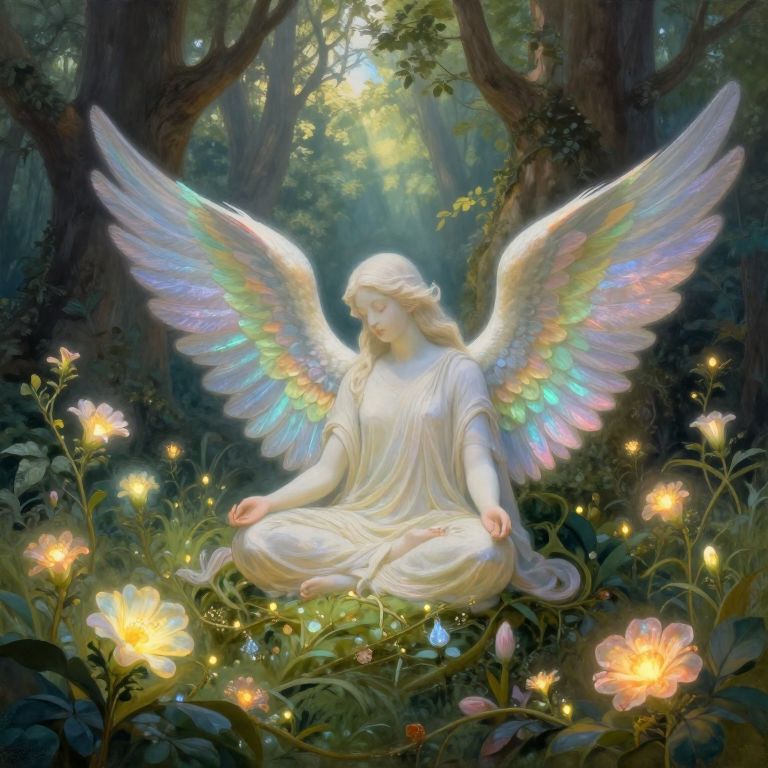 Digital painting of a silhouetted angel with vibrant rainbow wings, standing on a rocky peak, illuminated by a bright, glowing sun amidst swirling clouds