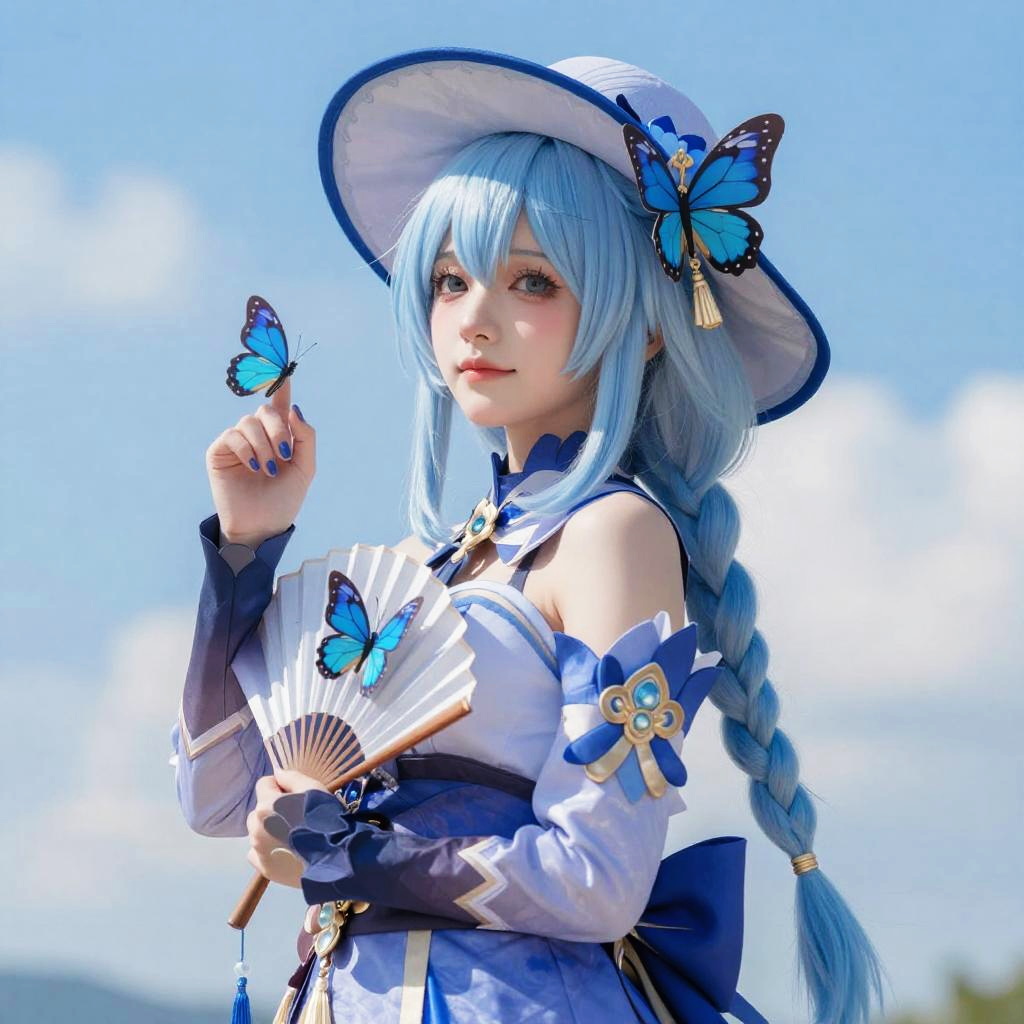(Realistic painting style:0.9), (faux traditional media:1.0), masterpiece, best quality, bokeh, depth of field, looking to the side, kamisato ayaka (springbloom missive), kamisato ayaka, official alternate hairstyle, official alternate costume, blunt bangs, butterfly hair ornament, hair flower, blue dress, 1girl, butterfly, grey eyes, flower, hair ornament, light blue hair, outdoors, solo, hat, sky, blue nails, cloud, bangs, long sleeves, holding, looking at viewer, blue butterfly, blurry, braid, dress, day, blurry foreground, blue sky, breasts, medium breasts, cloudy sky, blush, index finger raised, blue flower, smile, closed mouth, holding fan