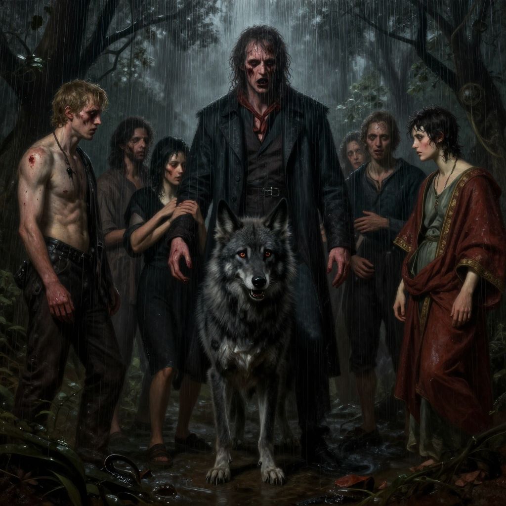 A dark, digital art depiction of a rain-soaked forest scene. At the center stands a tall, menacing, disheveled man with long, wet hair and blood-stained clothes, flanked by six other similarly rugged individuals. A large, gray wolf with piercing eyes is at their feet. To the right, a young woman with dark curly hair and a red robe stands out. The background is dense with trees and mist, enhancing the eerie atmosphere. The characters' expressions range from fearful to determined. The overall color palette is dark and moody, with emphasis on blues and blacks. The art style is realistic with a fantasy edge.