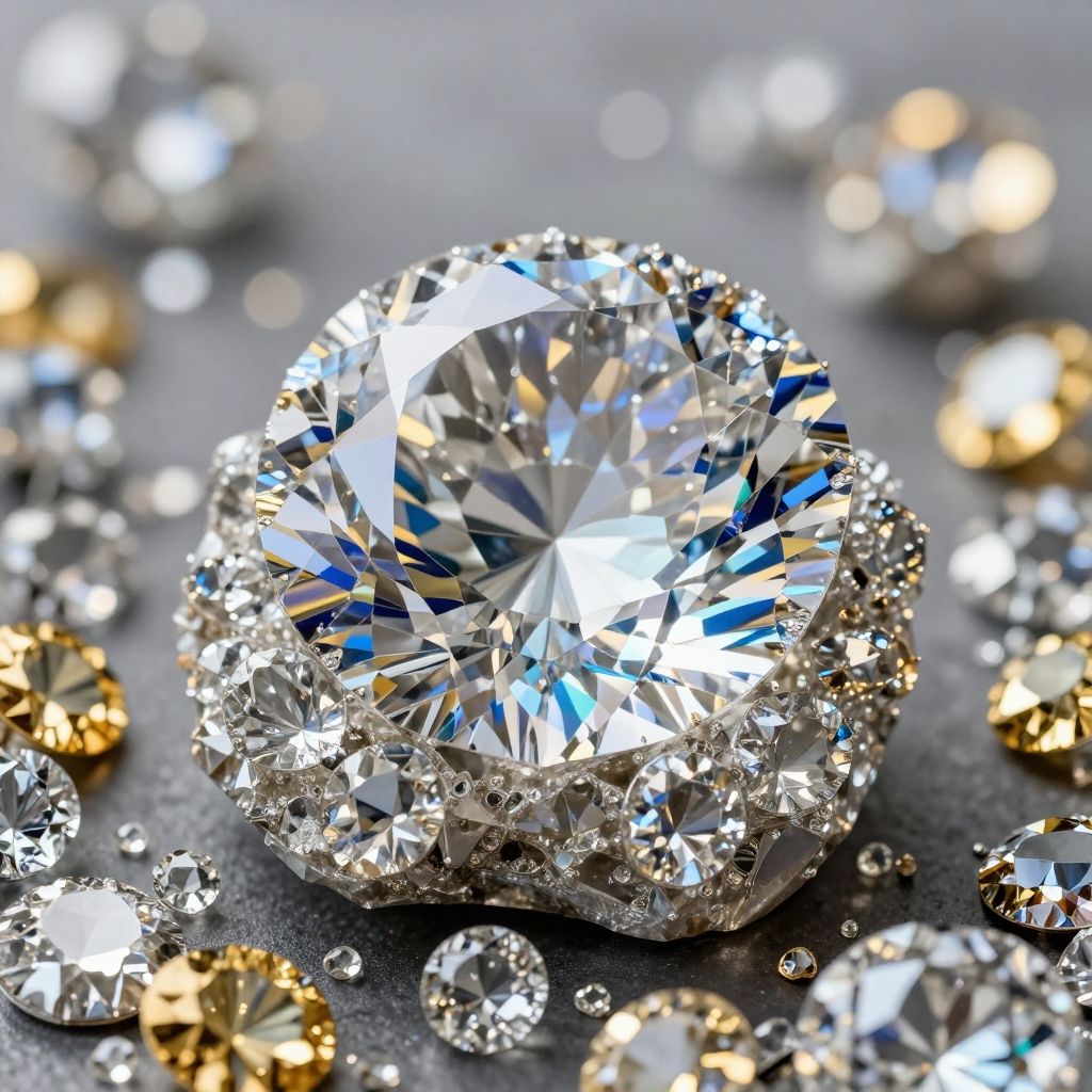 Close-up photograph of a large, sparkling, round-cut diamond surrounded by smaller, assorted diamonds on a gray textured surface.