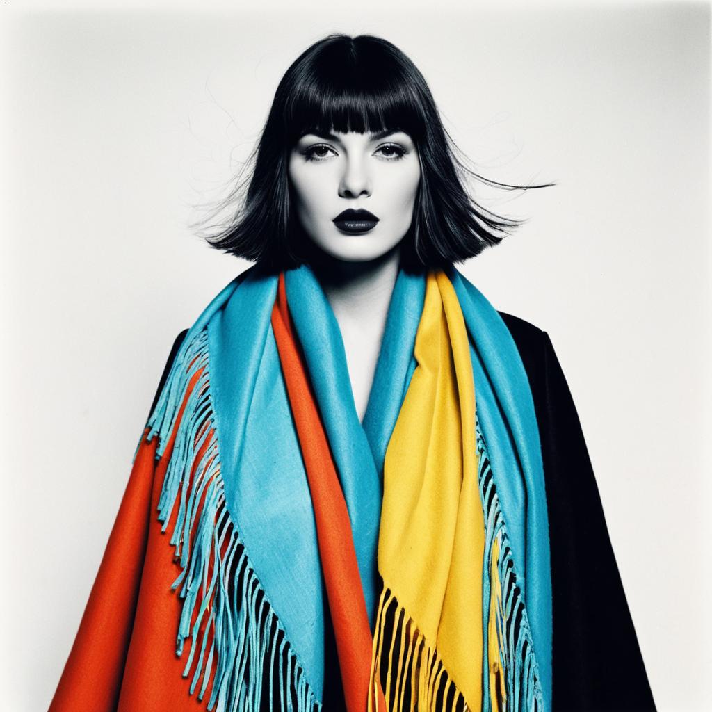 Black and white surreal fashion portrait of a female conceptual artist with short dark hair and bangs, wearing colorful fringe shawls in blue, orange, and yellow over a dark coat. The image features strong contrasts and dynamic aesthetics, reminiscent of analog photography styles by Richard Avedon and Ellen von Unwerth, with a film grain effect.