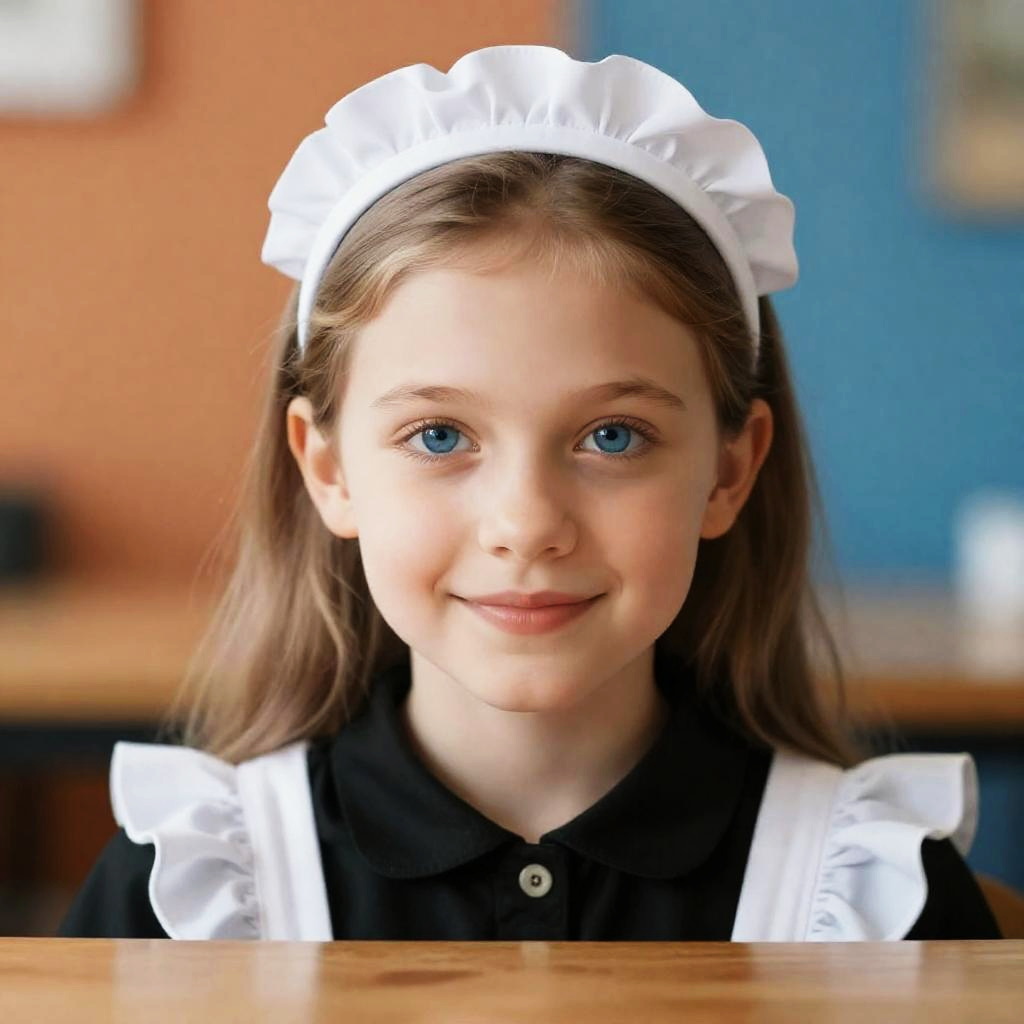 Close-up portrait of a young girl with blue eyes and fair skin wearing a white maid headband and a black dress with white ruffled shoulder details. She is smiling slightly, with a blurred orange and blue background and a wooden surface in the foreground.