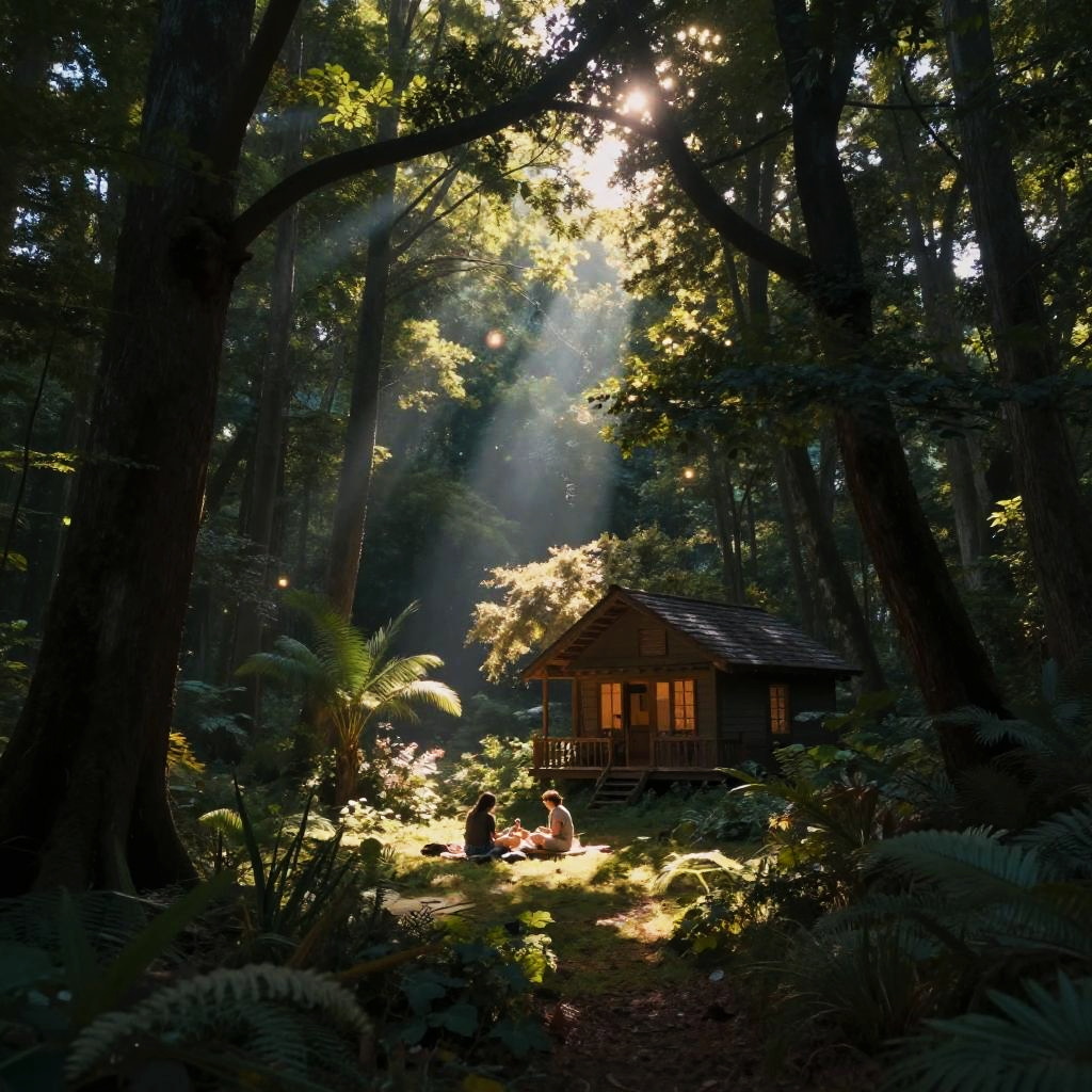 Photograph of a sunlit forest cabin with sunlight streaming through tall trees, illuminating ferns and a couple sitting outside.