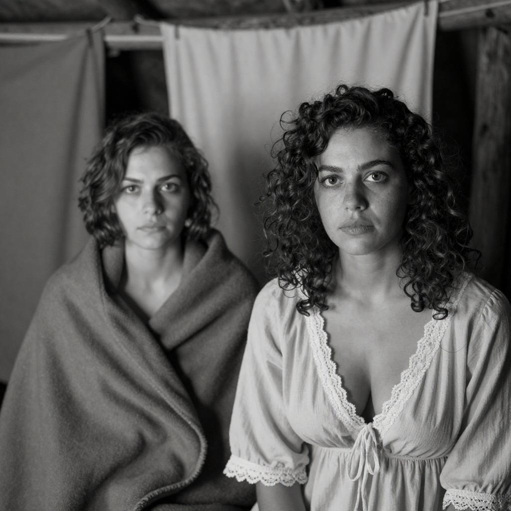 Black-and-white photograph of two women in a rustic, makeshift hut. Both women have intense expressions, with one looking directly at the camera and the other slightly to the side. Woman on the right has curly hair, loose dress with lace trim, and visible cleavage. Woman on the left has short, wavy hair, partially covered by a blanket. Fabric curtains and wooden beams frame the hut.
