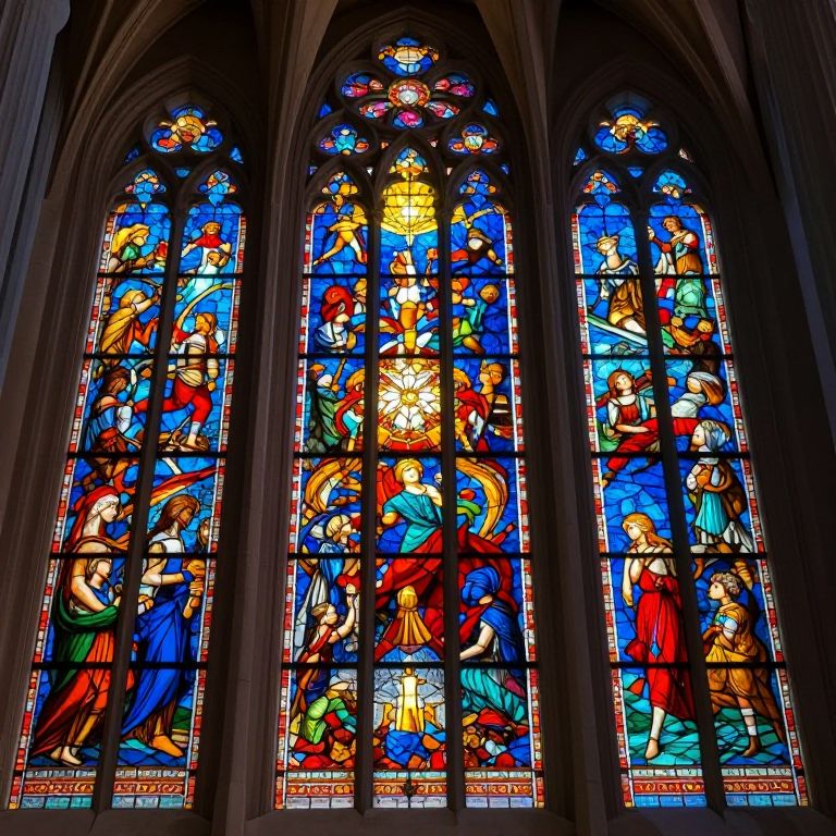 Vibrant stained glass window depicting biblical scenes with colorful figures, set in Gothic-style arches, showcasing intricate, detailed artwork.