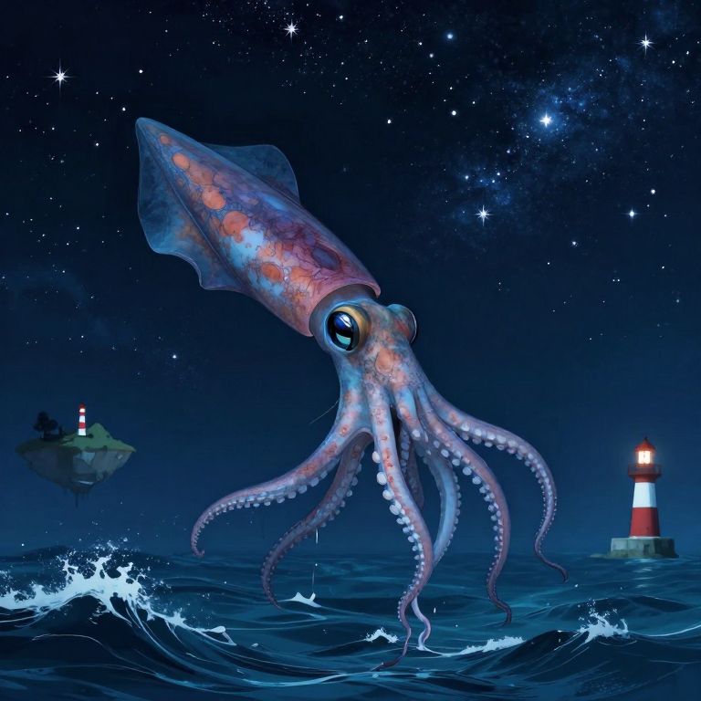 A colossal squid floats serenely above the ocean, its tentacles dripping ink into the waves while weaving a celestial tapestry of stars across the night sky, anchored by distant lighthouses and floating islands.