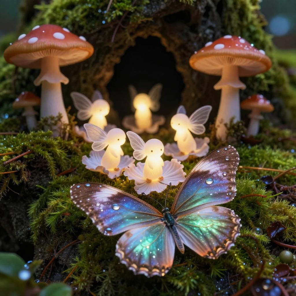 Celestial moss-covered enchanted grotto with phosphorescent fungi, endearing tiny glowing mushroom sprites with silk wings prancing among petals, a butterfly in the foreground formed from luminescent spore weave, dewdrops glitter, intricate textures, iridescent colors, macro realism, magical realism, hyperrealistic, volumetric light, soft bokeh, tactile details, storybook yet believable, 8k clarity