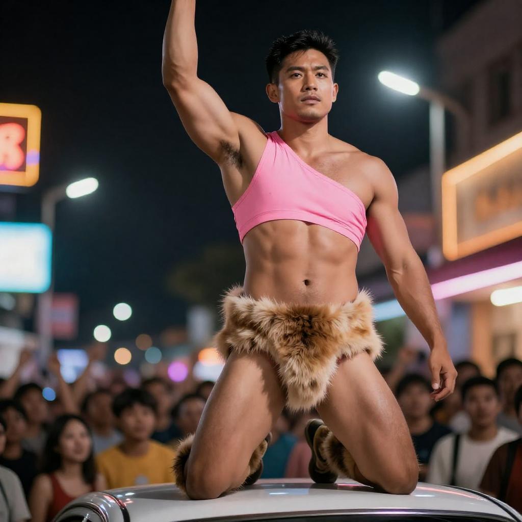 Man with muscular build, wearing pink chest wrap and fur loincloth, stands triumphantly on car roof, arm raised. Crowd below, blurred, with colorful lights and neon signs in background. Bright, dramatic lighting.