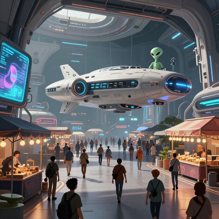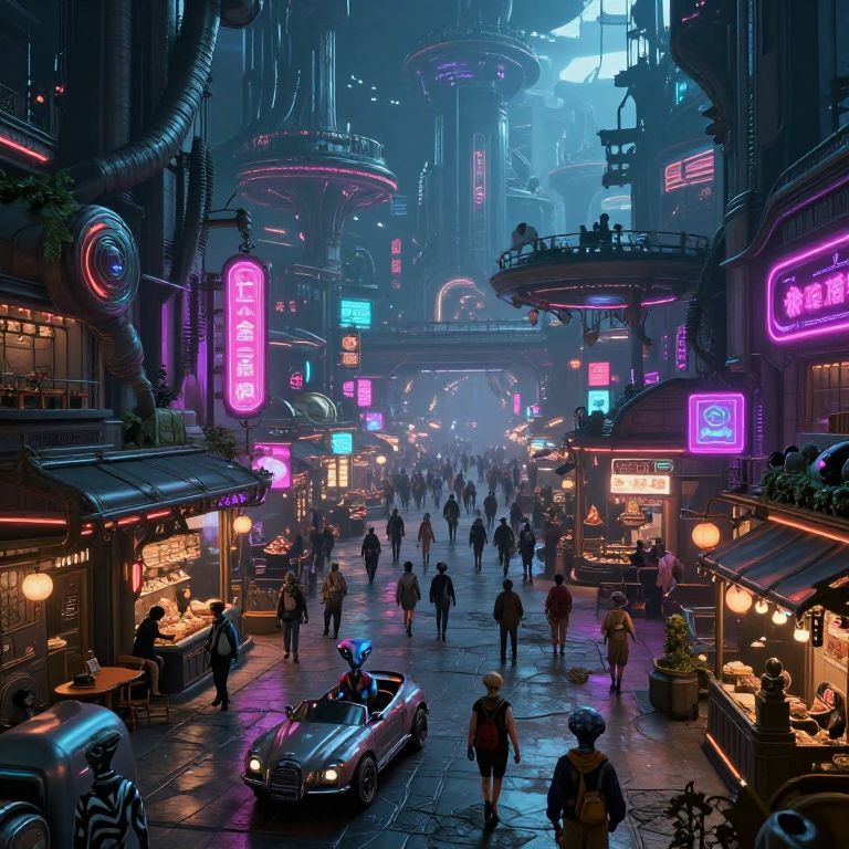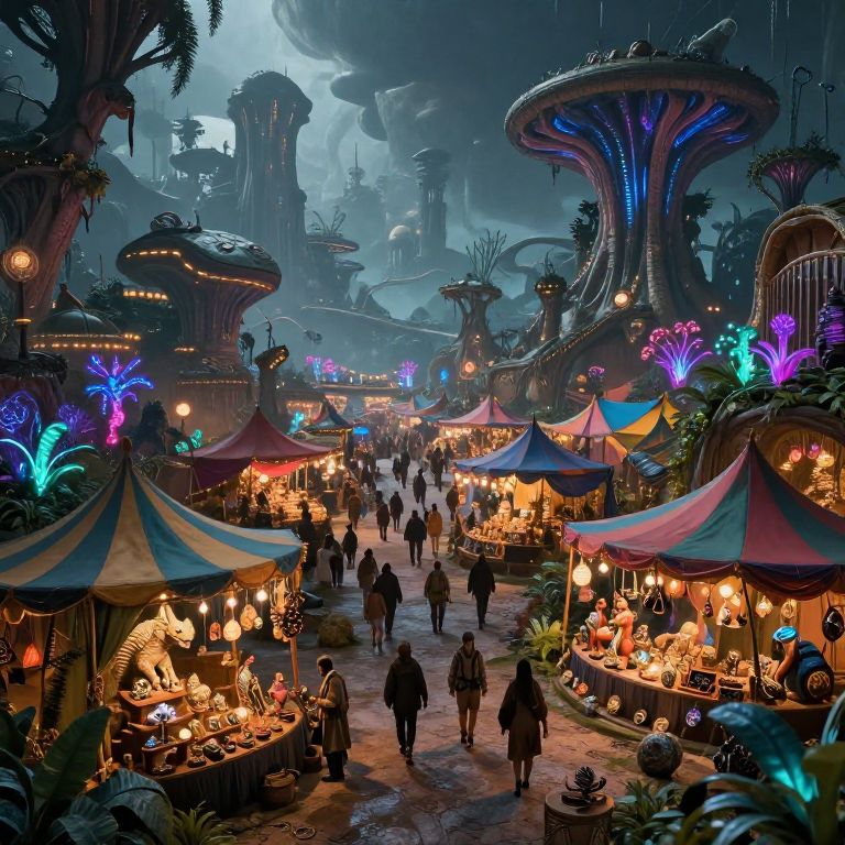 Prespectiva of a busy futuristic marketplace bustling with diverse alien species, viewed from a central stall looking outward, vibrant colors, exotic goods on display, intricate architectural details with holographic advertisements, highly detailed sci-fi scene.