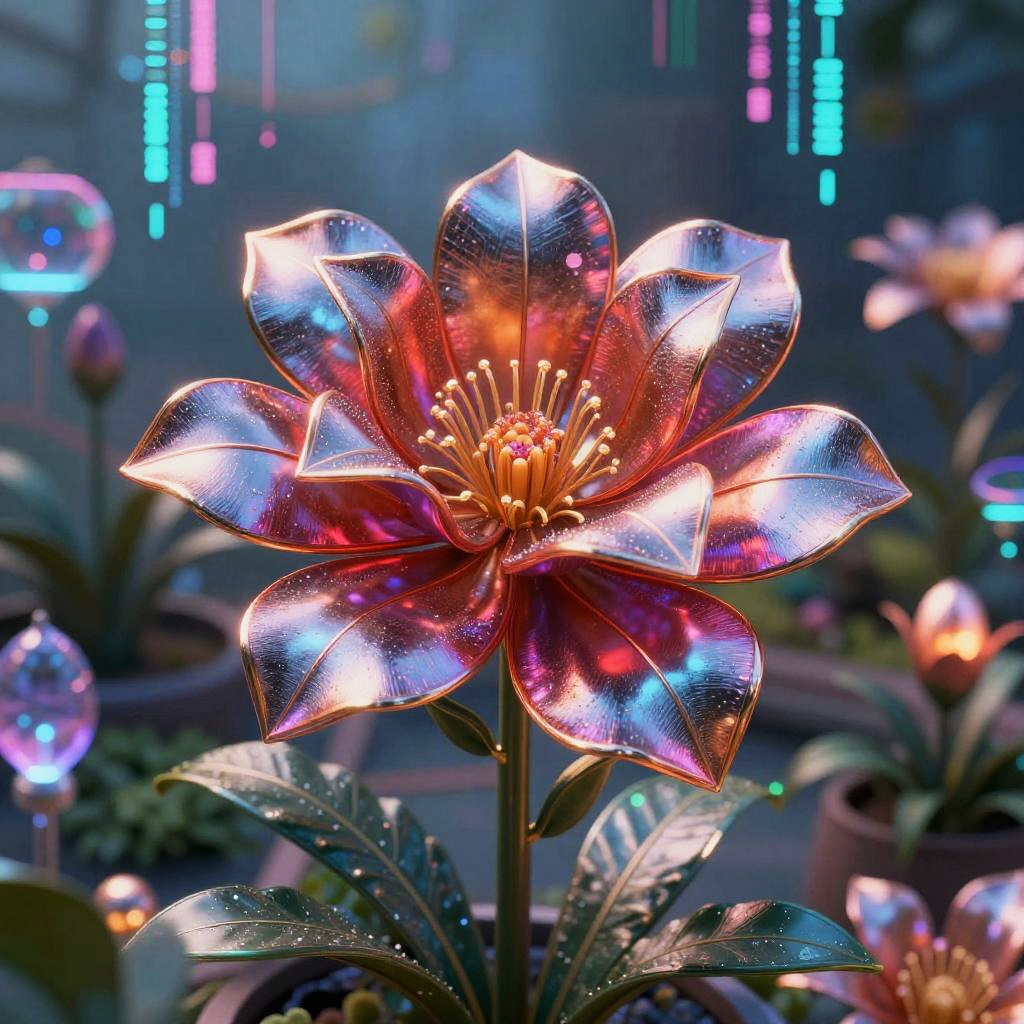 AI flower blooming in a futuristic garden, metallic petals shimmering with neon lights, surrounded by a digital landscape of data streams and holographic plants, hyper-realistic style with vibrant colors and intricate detail.