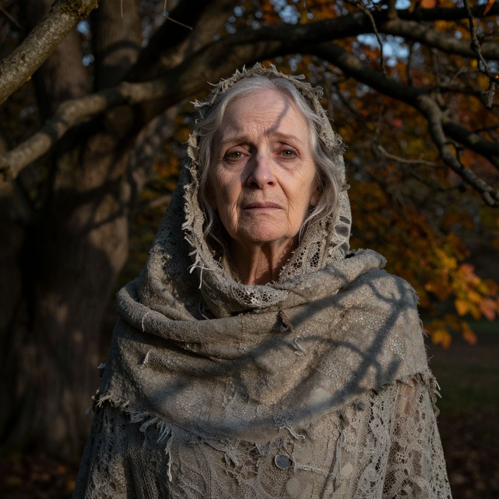 Photograph of an elderly woman with pale, wrinkled skin and gray hair, wearing a tattered, gray lace shawl that covers her head and shoulders. She stands in a dark, forested area with autumn leaves, creating a shadowy backdrop. Her expression is solemn and her eyes are slightly sunken. The lace shawl has a textured, frayed appearance, adding to the overall rustic and aged feel of the image. The lighting highlights her facial features while casting shadows from the tree branches in the background.