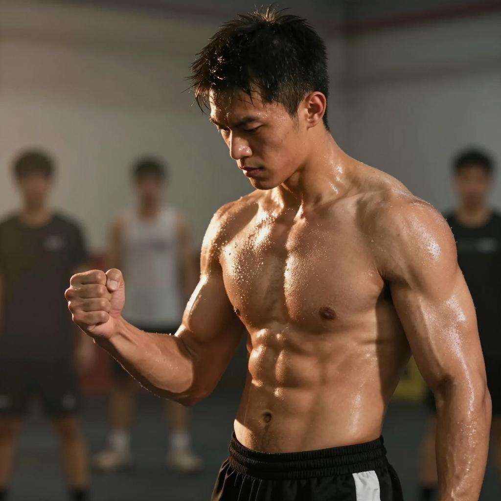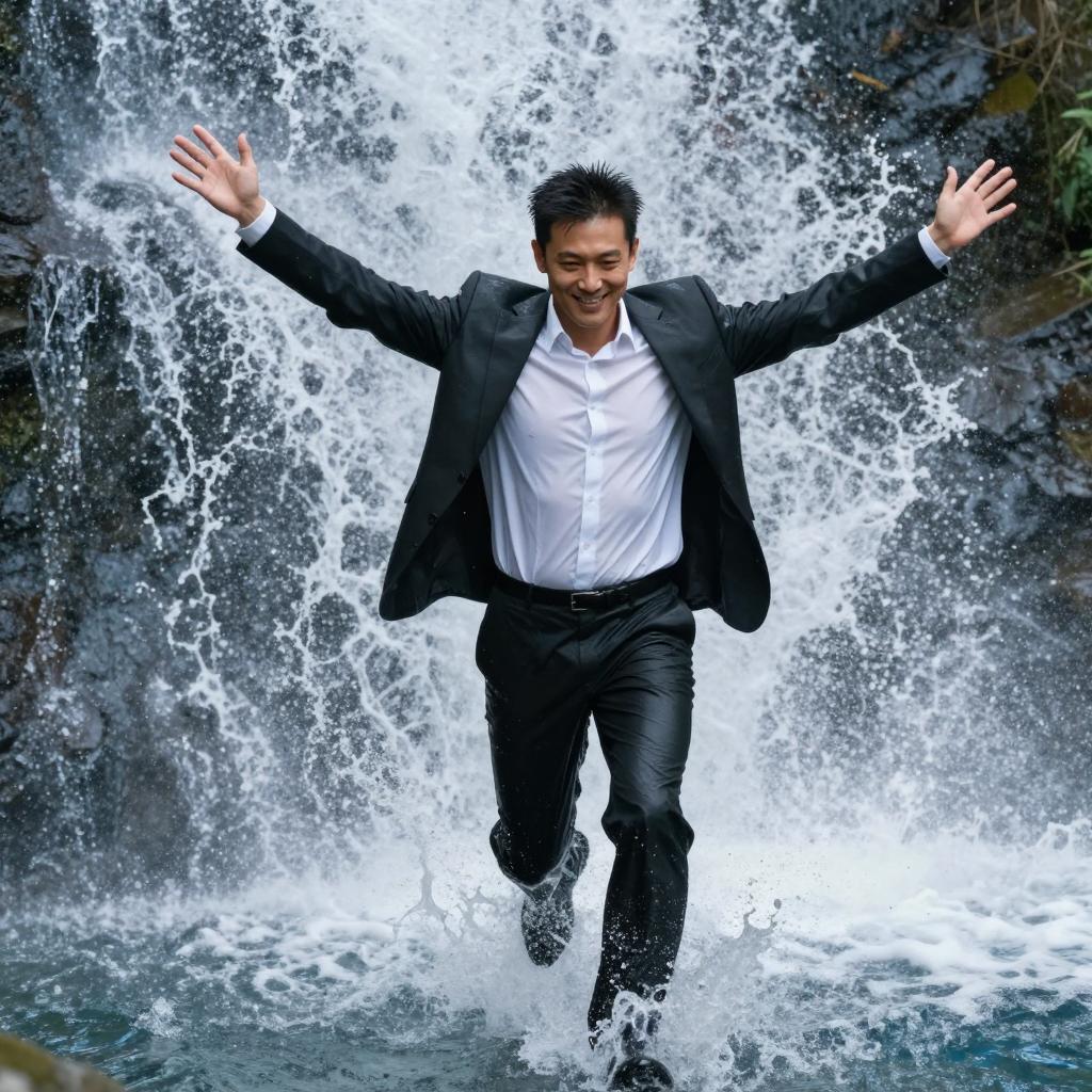 Group of six men running through water, splashing around. Central man in black tank top, blue jeans, intense expression, mouth open. Man on left in black long-sleeve shirt, camouflage pants, dark hair. Man on right in brown shirt, blue jeans. Others in tank tops and shirts, smiling, wet clothes. Bright water splash in foreground, dim background. Water droplets visible. All men muscular, short dark hair. Action shot.