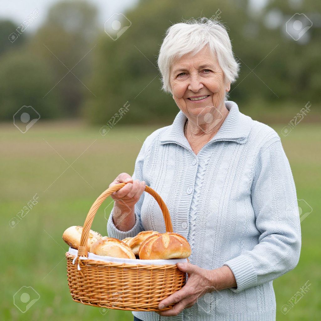 Photograph of an elderly white woman with short, white hair, wearing a light gray, knitted sweater. She stands in a sunlit, green field with a clear blue sky in the background. She holds a wicker basket filled with several loaves of bread in both hands. She has a gentle smile and wrinkles on her face, suggesting age. The texture of her sweater appears soft and cozy, contrasting with the woven texture of the basket. The image is bright and cheerful, capturing a moment of simple, rural life.