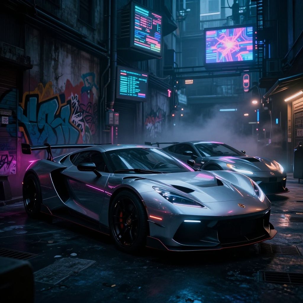 Cyberpunk fastest cars parked in a gritty urban alley with neon graffiti, futuristic tech details, chrome and LED accents, moody night scene, fog and scattered holographic ads, dystopian vibe