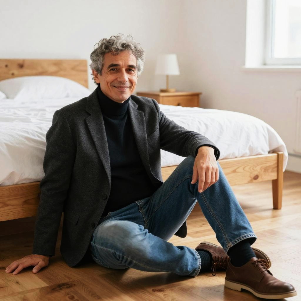 Photograph of a middle-aged man with short, curly gray hair and a slight smile, sitting on a wooden floor in a bright, minimalistic bedroom. He's wearing a dark gray blazer, black turtleneck, blue jeans, and brown shoes. Behind him is a simple wooden bed with white sheets, a small nightstand with a white lamp, and a window letting in natural light.
