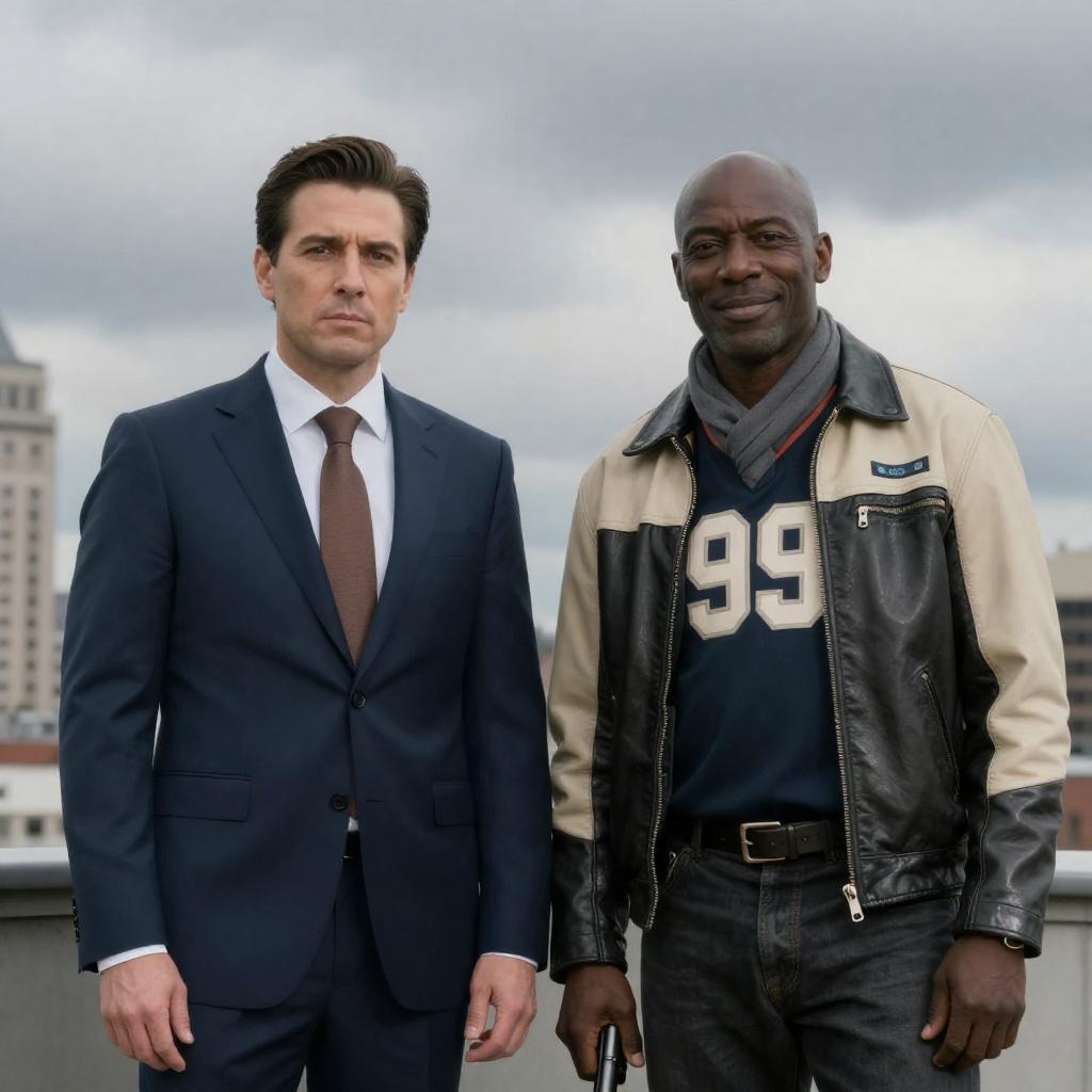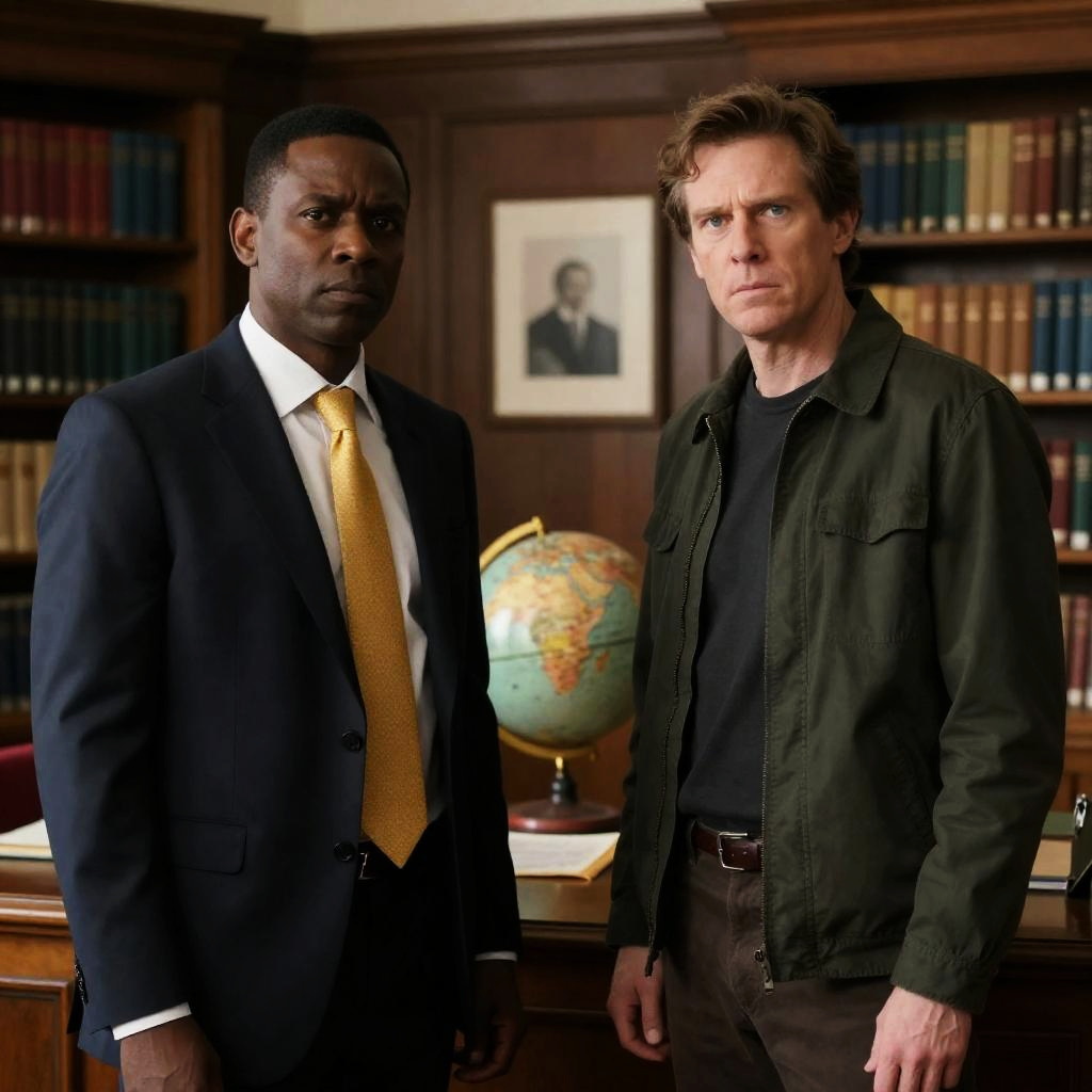 Photograph of two men in a wooden library. Black man in dark suit, white shirt, yellow tie, serious expression, left. White man in dark green jacket, brown hair, intense expression, right. Shelves of books in background. Globe on desk. Red chair. Framed pictures. Men stand facing each other.