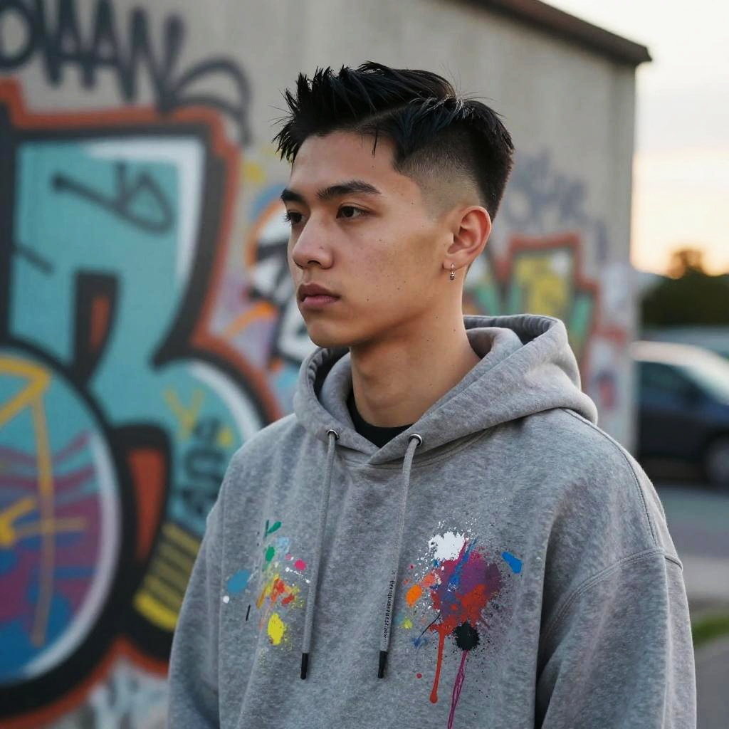 Slick Back Undercut hairstyle on street artist, wearing paint-splattered hoodie, in graffiti wall, captured in fashion editorial style with soft sunset glow.