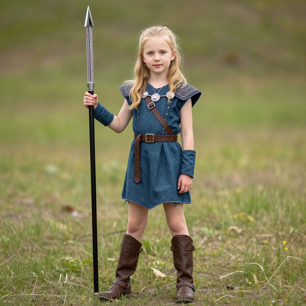 Photograph of a young blonde girl in a blue medieval dress, brown belt, and boots, holding a spear, standing on grass.