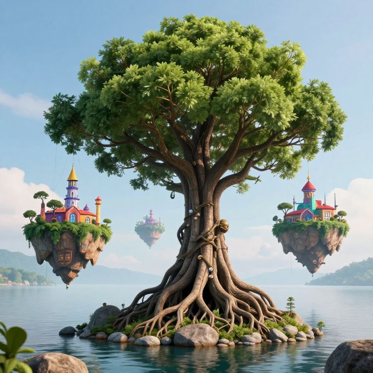 Colossal tree rooted in rocky terrain extends its sprawling branches over calm waters, suspending three vibrant green floating islands that cradle colorful structures, each inhabited by societies of wind-tethered architects defying gravity beneath a serene sky.
