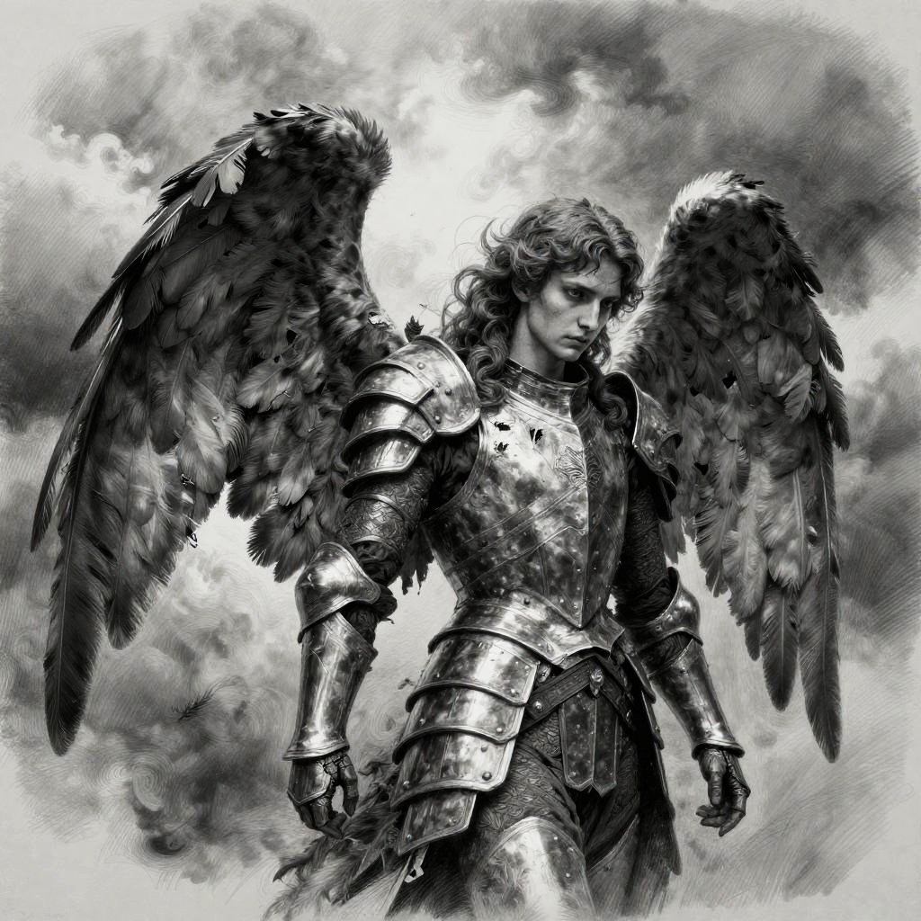 Baroque mysterious oil painting of seraphic eagle-knight in sunlit mountaintop with swirling golden clouds, noble sculpted visage, glowing eyes, ornate armor with white and gold accents. Golden flames or radiant energy halo the head, casting rim light; drifting dust and light particles. High detail, volumetric glow, atmospheric depth, dynamic shadows, epic mood, painterly textures, mythic grandeur, cool-to-warm color contrast.
