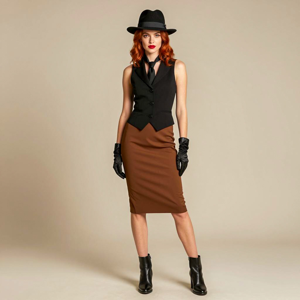 Photograph of a woman in a red plaid off-shoulder dress and black high heels. She holds a black hat with a wide brim and a black fur stole. She wears black gloves and stands in a stone corridor with arches and intricate carvings. Her head is tilted, and she touches her hat with one gloved hand. She has a medium build and fair skin. The background includes stone walls and a round decorative pattern on the wall.
