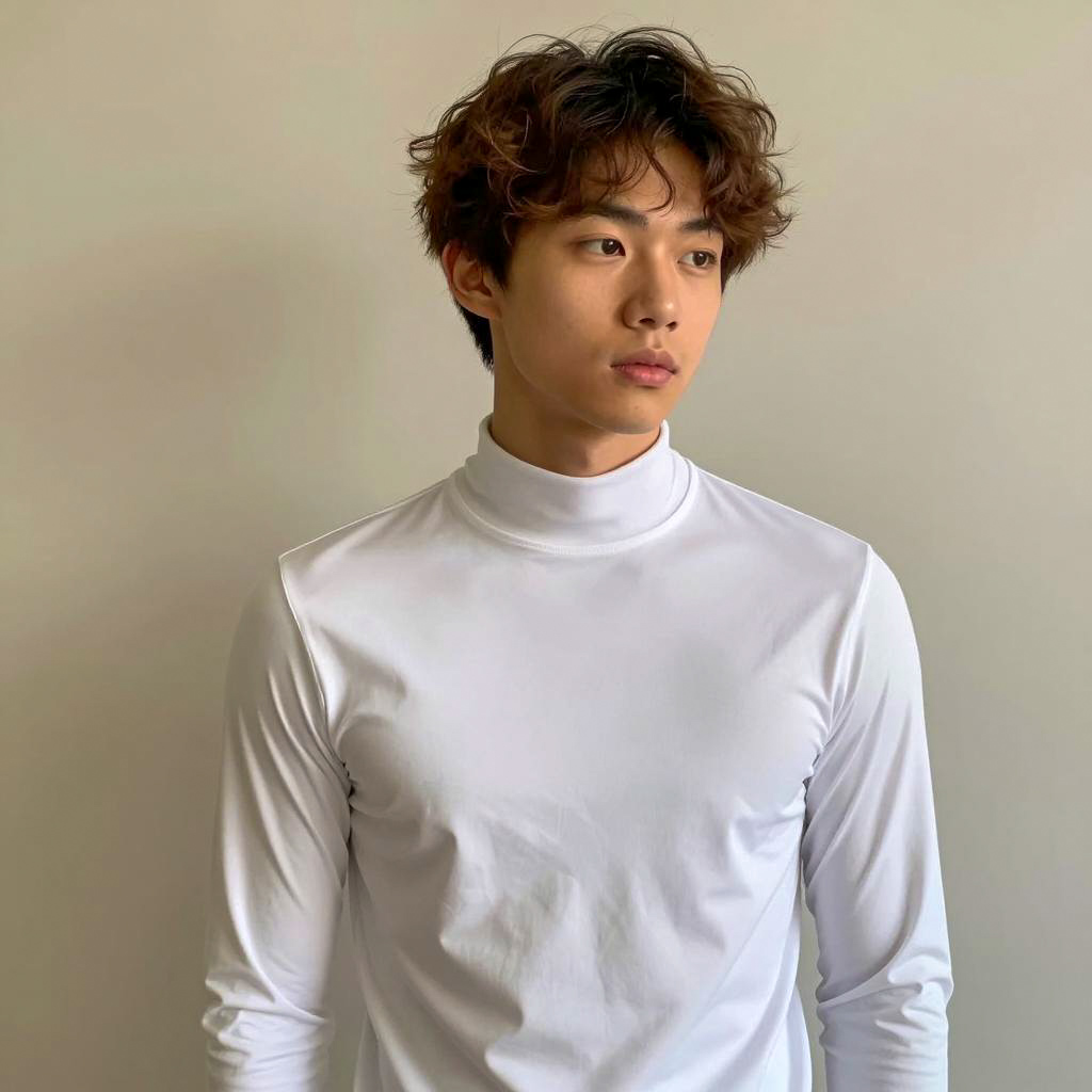 Tee shirt costume, photograph of young man standing, orange t-shirt, dark brown pants, aviator goggles on head, black necklaces, hands in pockets, serious expression, light skin, short dark hair, white background, rectangular black-framed picture behind him, studio lighting, casual style, frontal view, simple background, minimalistic, modern fashion