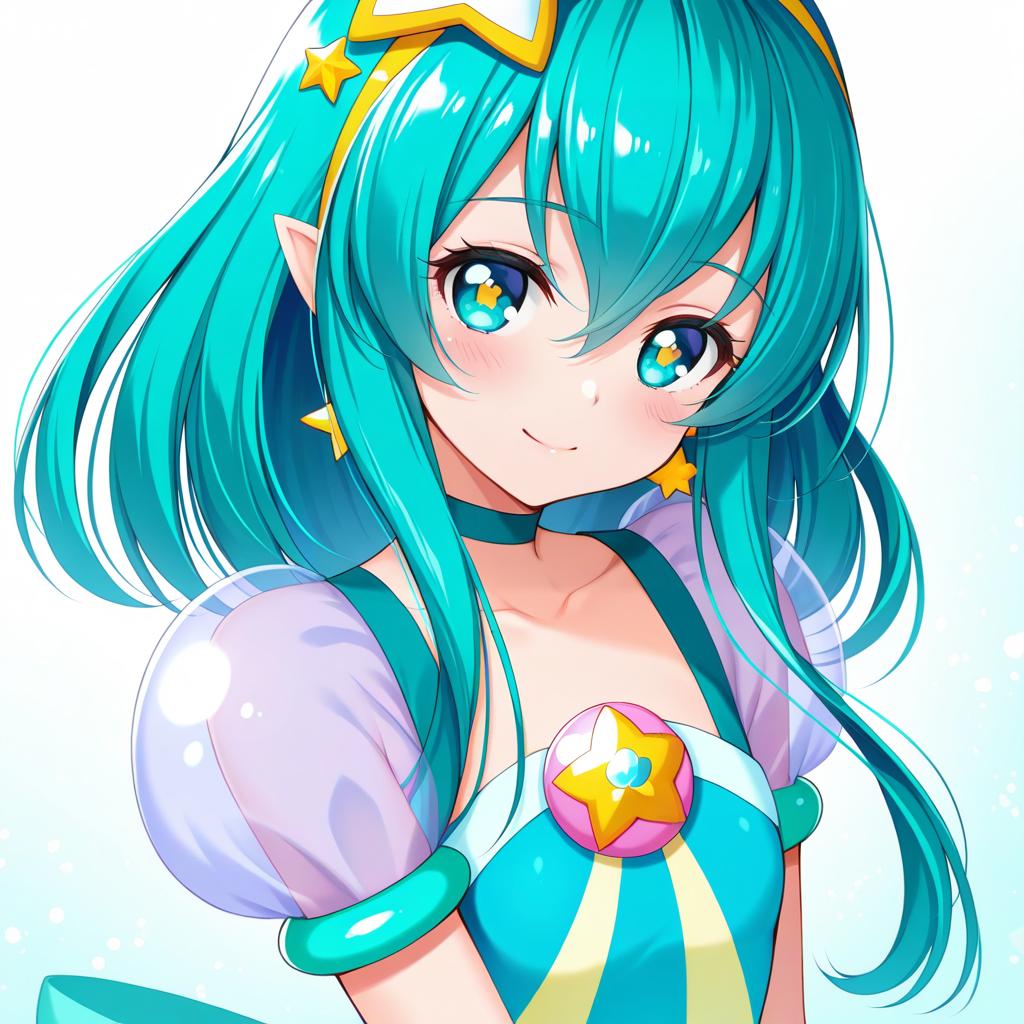 Digital illustration of an anime-style magical girl with aqua blue hair, star-shaped pupils, and star-themed accessories. The character has pointy ears, aqua eyes, a yellow hairband, star hair ornament, and puffy translucent sleeves. She wears a teal and yellow dress adorned with a large star brooch, a matching choker, and star earrings, embodying a vibrant and whimsical magical girl design.