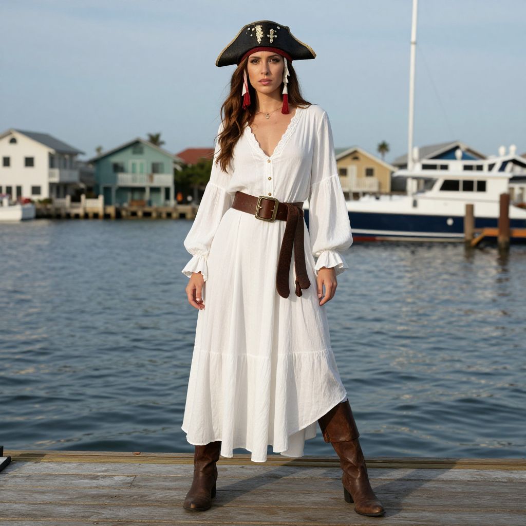 Photograph of a woman standing on a wooden dock by a calm waterfront. She has long, wavy brown hair and wears a black pirate hat with a gold emblem, a white, long-sleeved, V-neck, billowy dress with a brown belt, and dark brown knee-high boots. The background features a clear blue sky, a white boat, and several houses with pastel-colored facades. The woman's expression is serious, and she stands with her hands by her sides, exuding a pirate-like aura. The dock's planks are visible in the foreground.