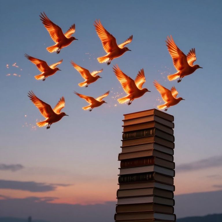 A flock of birds with luminous, fiery wings soars gracefully above a towering stack of books, defying gravity as they create a mesmerizing dance against the backdrop of a twilight sky.