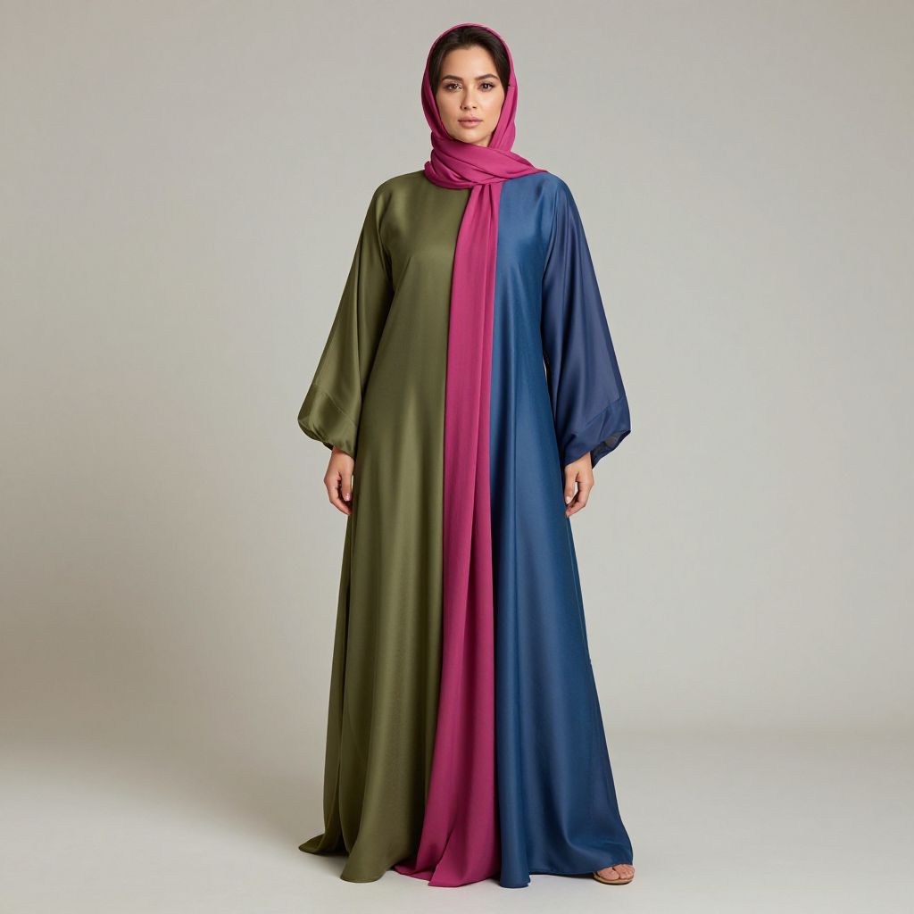 Photograph of a woman standing, wearing a long, two-toned robe in olive green and navy blue, with a vibrant pink headscarf.