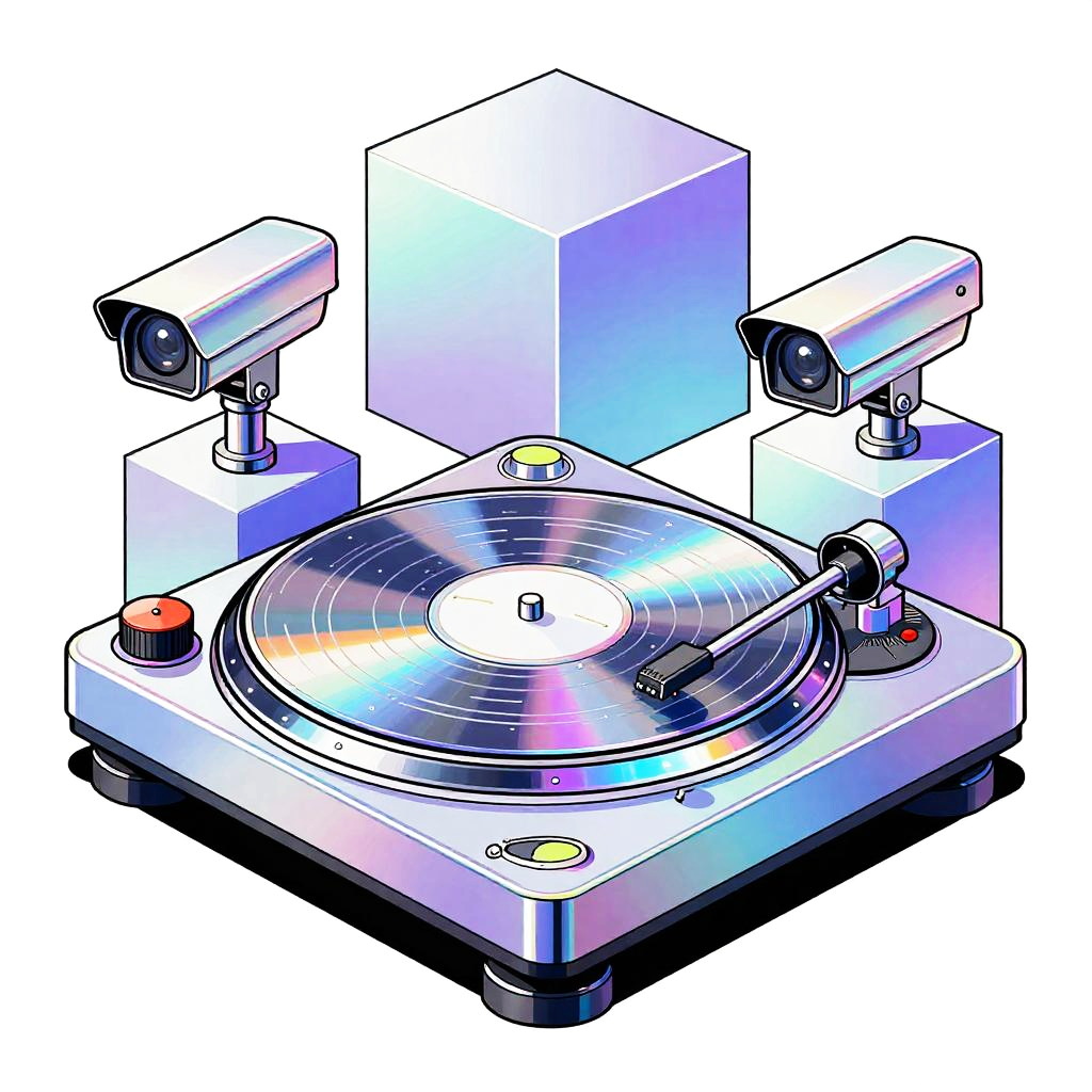 Pop-art inspired illustration of a iridescent chrome turntable, featuring cubo-futurist elements, security camera aesthetics, vector style, influenced by Outrun and Adrian Tomine