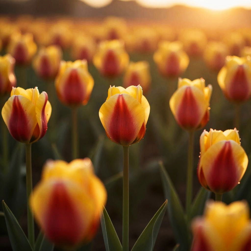 Close-up of tulipanes in a field at sunset, warm golden tones illuminating the red and yellow petals, subtle bokeh effect with soft shadows and atmospheric depth, painterly yet photorealistic style