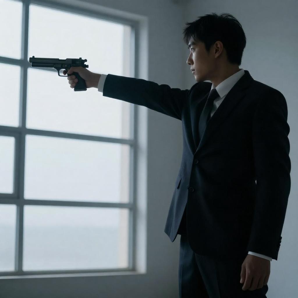 A photograph of a silhouetted man in a dark suit, holding a gun and pointing it forward. He stands in a brightly lit room with blue-tinted light coming from a grid window on the left. His face is partially shadowed, adding a mysterious tone. The man's right hand grips the gun firmly, while his left hand is slightly visible.