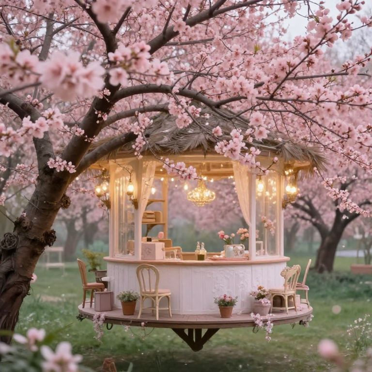 Photograph of a whimsical, white, round gazebo-style café suspended by a tree branch, surrounded by blooming pink cherry blossoms. The gazebo has a thatched roof, lit by warm, glowing chandeliers, and is furnished with a small wooden table, four chairs, and potted flowers. The background features a serene, green grassy area with more cherry blossom trees. The soft, pastel pink and white colors create a dreamy, romantic atmosphere. The image is detailed and realistic, capturing the delicate textures of the blossoms and the wooden furniture.