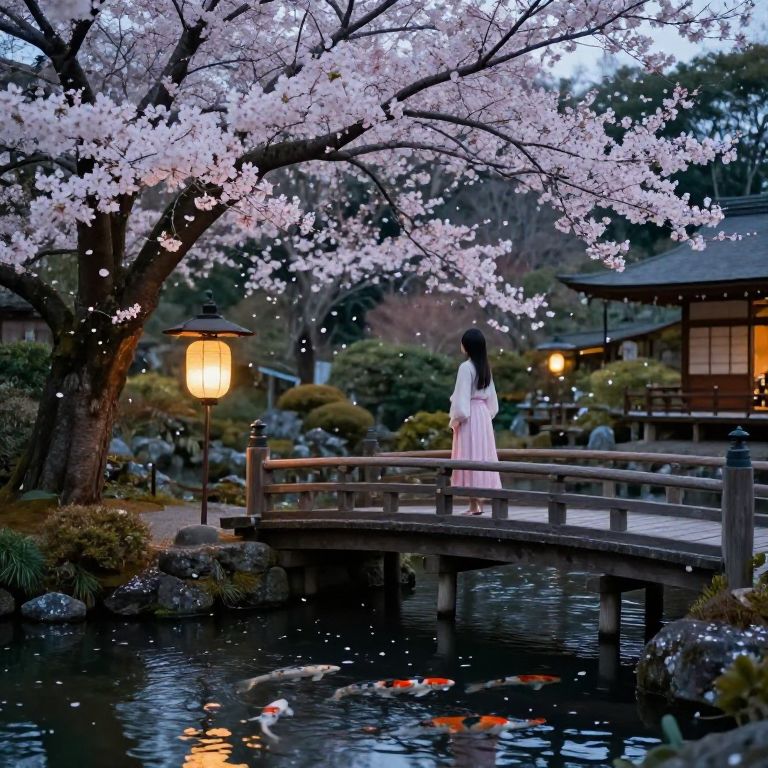 Whimsical peach blossom cafe floating in a fantasy garden, tree branches heavy with pink blossoms, fairy lights, antique furniture, magical and serene, soft focus painting style