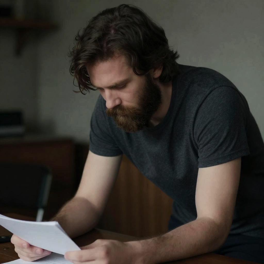 Photograph of a muscular man with a shaved head, wearing a sleeveless, striped navy and white tank top, leaning forward with his right hand on his head. He is looking down at a desk with papers and a lamp in the background. His expression is concerned. The scene is dimly lit.