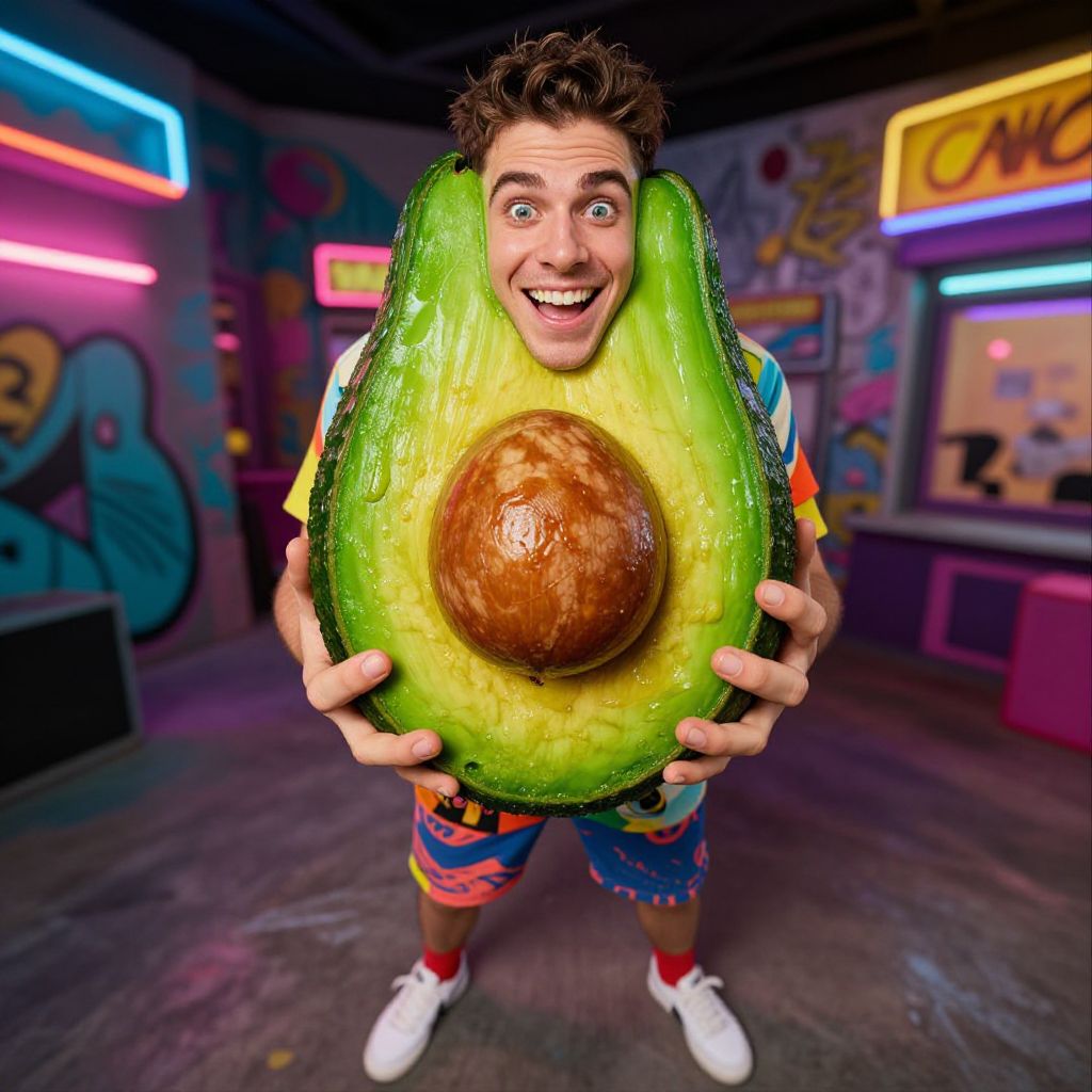 Photograph of a young man with a surprised expression, holding a large, hyper-realistic, green avocado with a brown pit in front of his chest. He has short, dark brown hair, and is wearing a colorful, tie-dye shirt and matching shorts, along with white sneakers. The background is a brightly lit, graffiti-covered arcade room with neon signs in pink, blue, and yellow, and a classic arcade machine on the right. The image has a surreal, playful vibe, with vibrant colors and exaggerated realism. The man's wide eyes and big smile add to the whimsical feel.