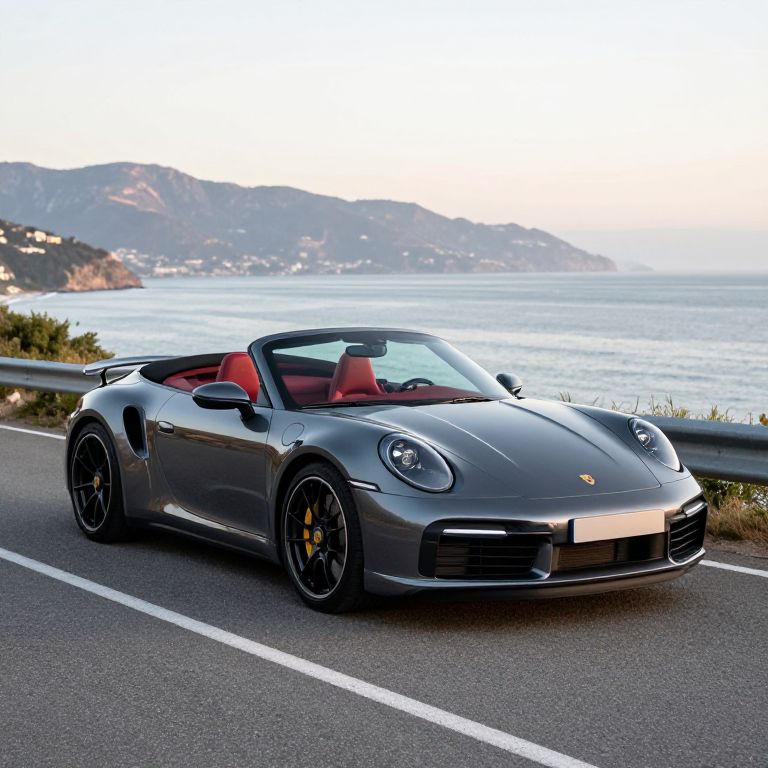 Porsche 911 Turbo Cabrio gleams in dark metallic paint as it sits poised on a coastal road, its vibrant red interior contrasting sharply against the serene backdrop of distant mountains and calm waters.